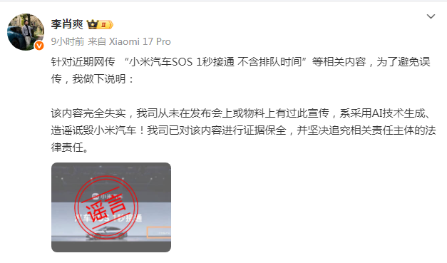 10月23日,21财经《辟谣财知道》注意到,针对近期网传 “小米汽车SOS 1秒接通不含排队时间”等相关内容,小米汽车副总裁李肖爽发文称,该内容完全失实,公司从未在发布会上或物料上有过此宣传,系采用AI技术生成、造谣诋毁小米汽车。公司已对该内容进行证据保全,并坚决追究相关责任主体的法律责任。