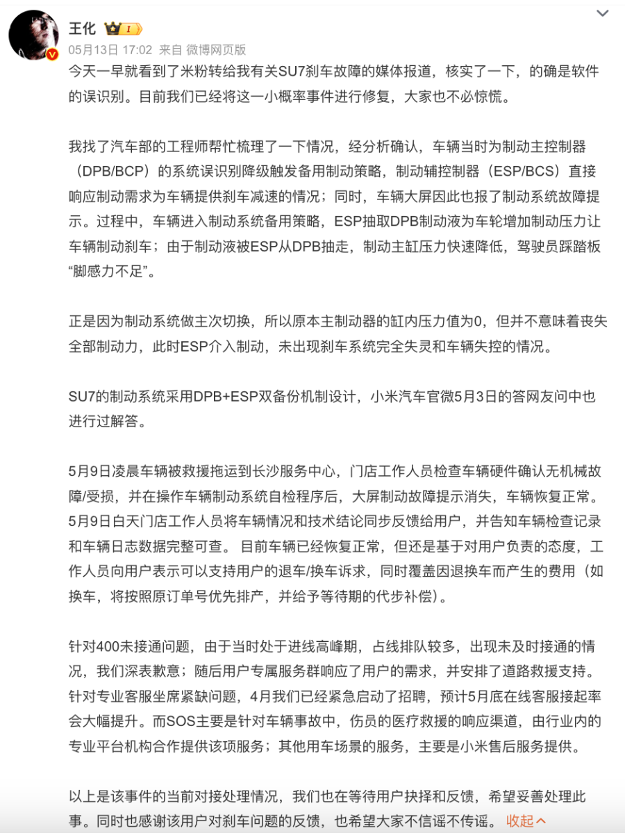 值得注意的是,这并非小米SOS系统首次引发争议。公开报道显示,2024年5月,湖南一小米车主曾反映,其新购的小米SU7在停车时突遇刹车失灵,车内显示“制动系统故障”等异常信息。尽管车辆最终自动停止,但李先生呼叫SOS急救系统时遭遇长时间无人接听,一个半小时后才获本地道路救援。