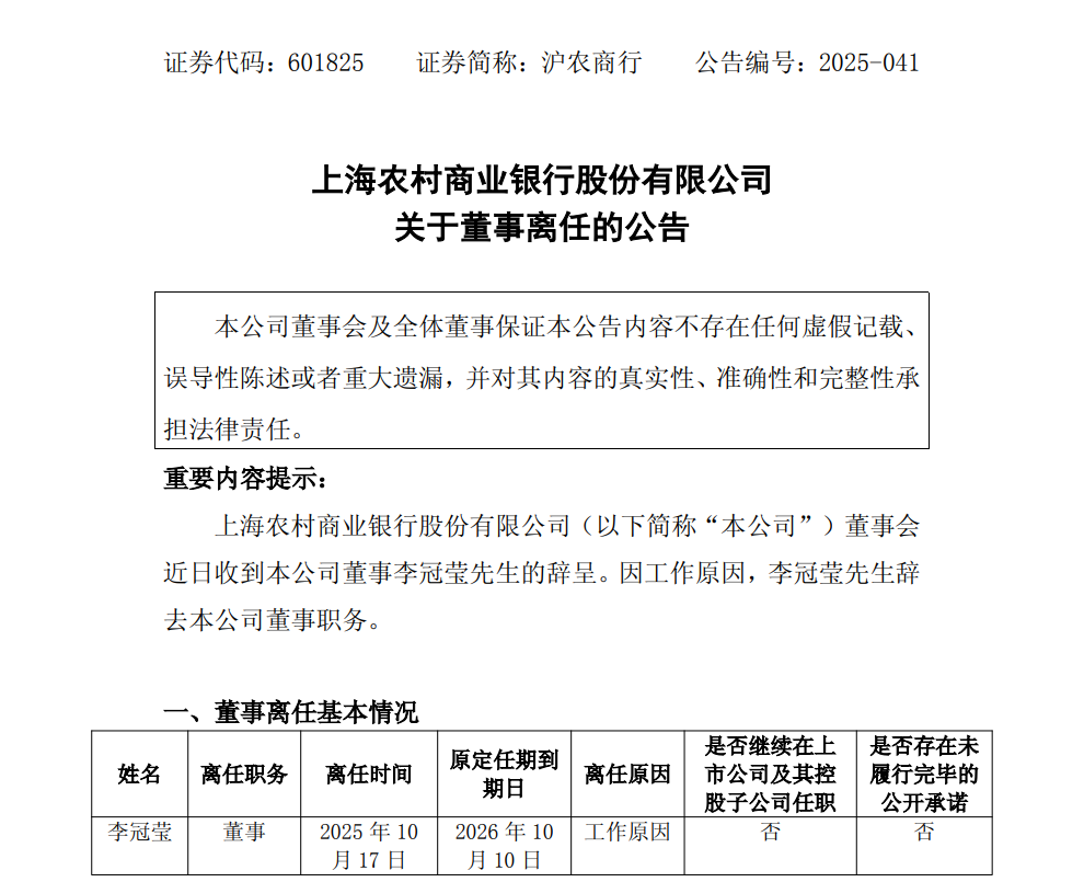 10月20日晚,上海农商行发布公告,李冠莹因工作原因,辞去该行董事职务,离任时间为10月17日,而原定任期至2026年10月10日,离任时间较原定任期将近提前一年。