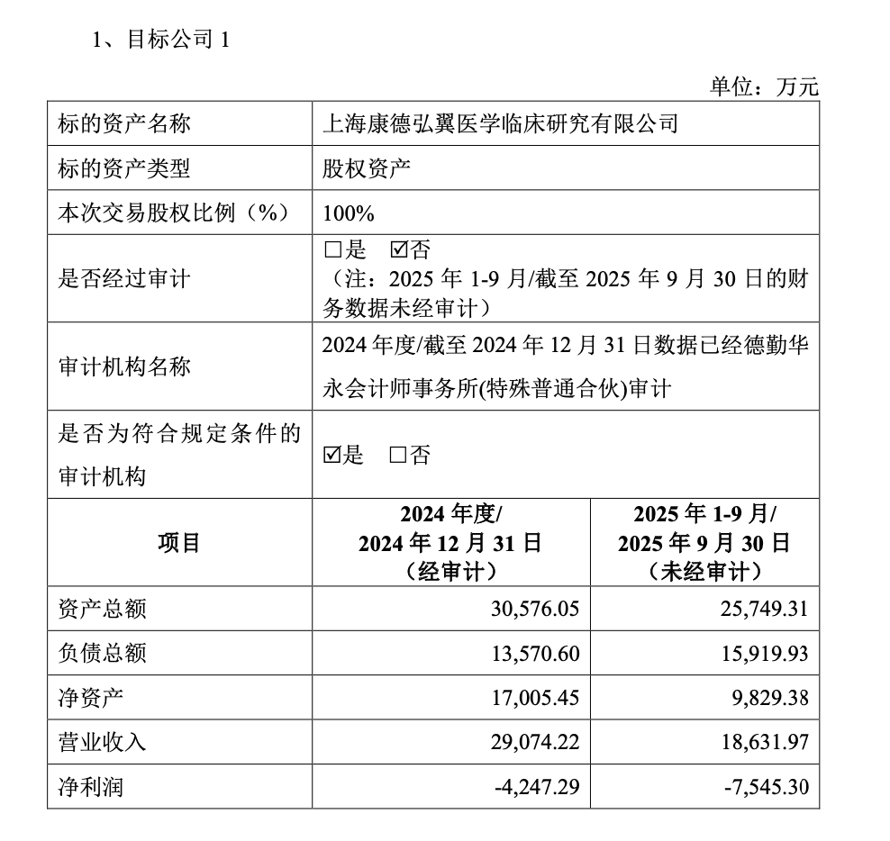 据公告披露,两家公司的业绩分化明显:康德弘翼2024年以及2025年前三季度实现营收分别为2.91亿元、1.86亿元,同期净利润分别为-0.42亿元、-0.75亿元,仍处于亏损状态,相比之下,津石医药表现稳健,2024年以及2025年前三季度实现营收分别为13.38亿元、9.79亿元,同期净利润分别为3.13亿元、1.62亿元。
