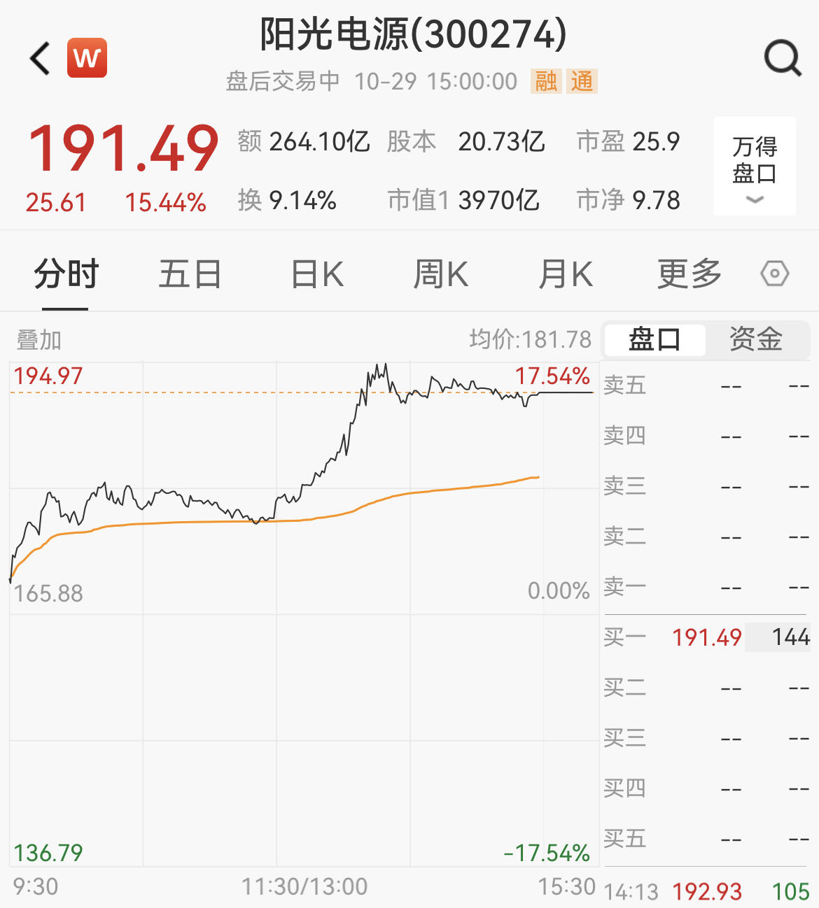 10月29日,光伏储能龙头企业阳光电源(300274.SZ)股价持续走高,盘中涨幅一度达17.54%至194.97元/股,续创历史新高,总市值一度突破4000亿元大关。