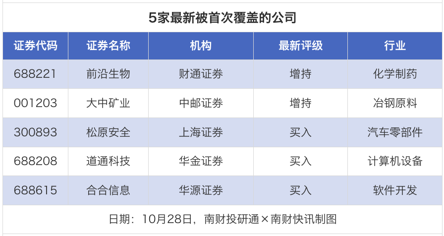 首次覆盖方面,10月28日券商共给出了5次首次覆盖,其中前沿生物获得财通证券给予“增持”评级,大中矿业获得中邮证券给予“增持”评级,松原安全获得上海证券给予“买入”评级,道通科技获得华金证券给予“买入”评级,合合信息获得华源证券给予“买入”评级。