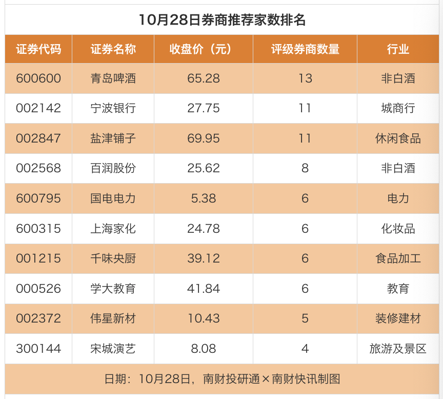 从券商推荐家数来看,10月28日有262家上市公司得到券商推荐,其中青岛啤酒获得13家推荐,宁波银行、盐津铺子均获得11家推荐。