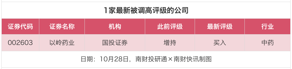评级调高方面,10月28日,国投证券对以岭药业的评级从“增持”调高至“买入”。