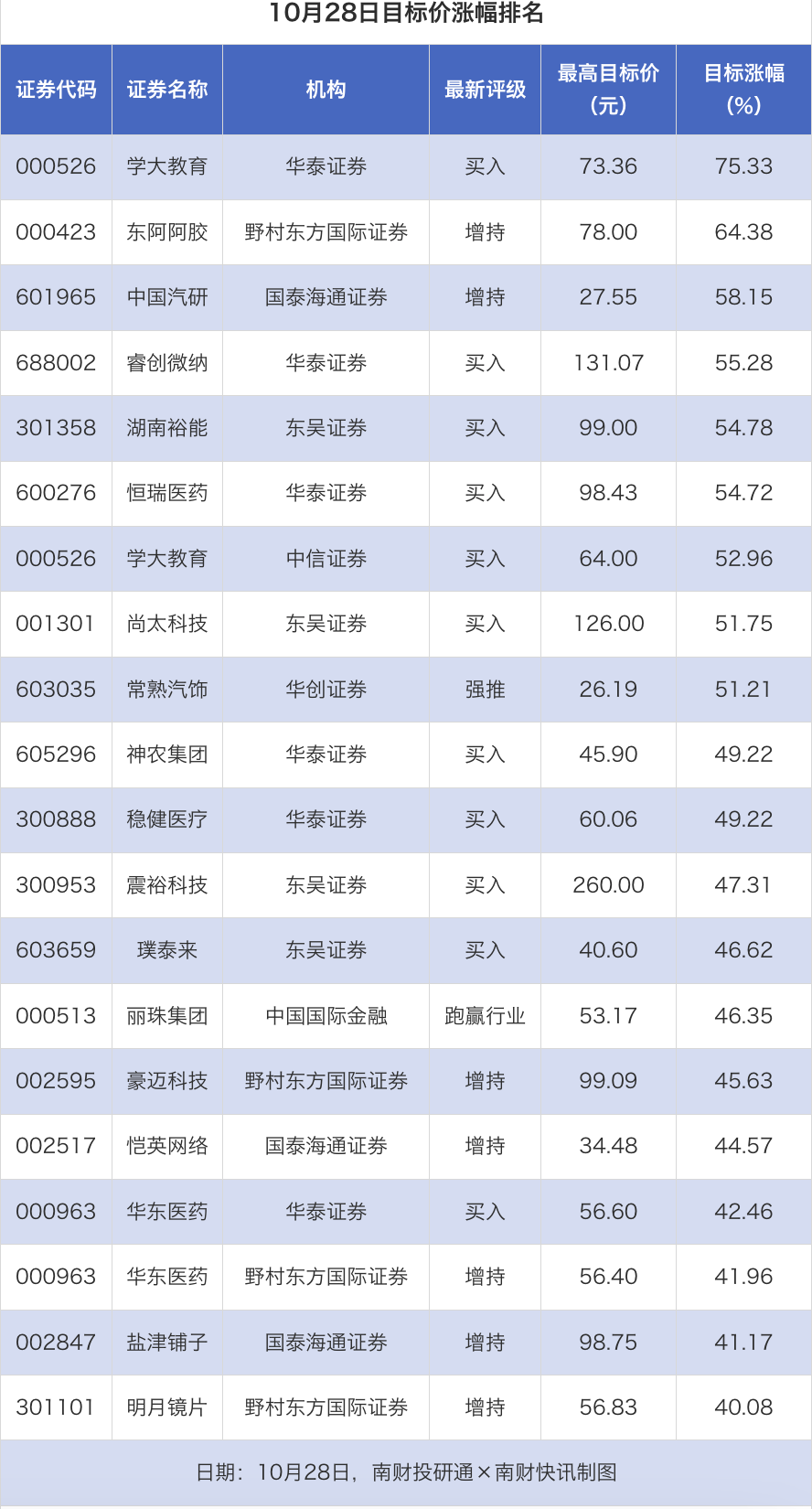南财投研通数据显示,10月28日,券商给予上市公司目标价共182次,按最新收盘价计算,目标价涨幅排名居前的公司有学大教育、东阿阿胶、中国汽研,目标价涨幅分别为75.33%、64.38%、58.15%,分别属于教育、中药、汽车服务行业。