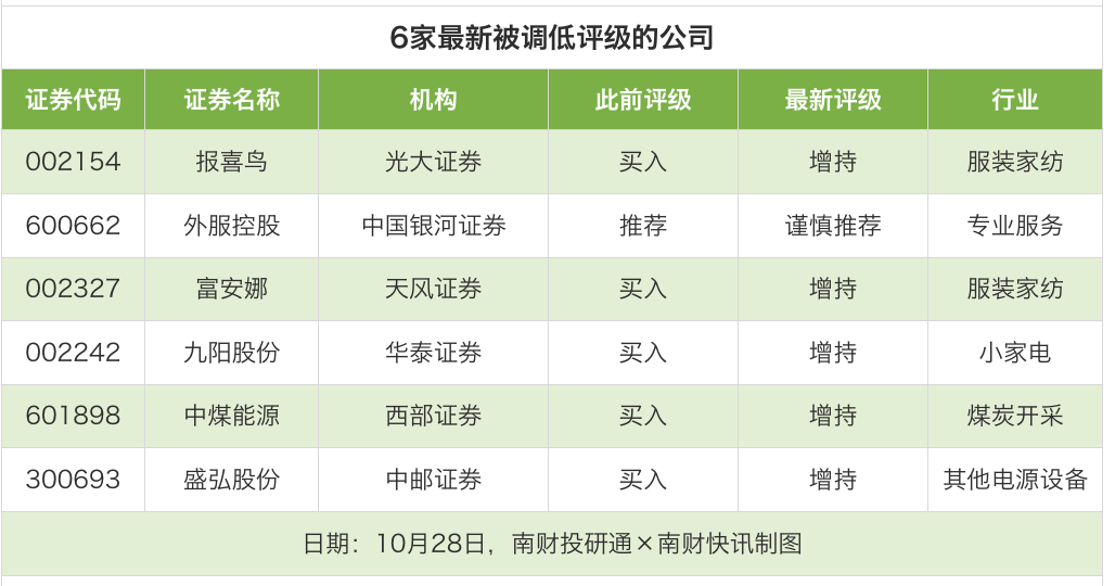 评级调低方面,10月28日,券商调低上市公司评级达到6家次,最新数据包括了光大证券对报喜鸟的评级从“买入”调低至“增持”,中国银河证券对外服控股的评级从“推荐”调低至“谨慎推荐”,天风证券对富安娜的评级从“买入”调低至“增持”。