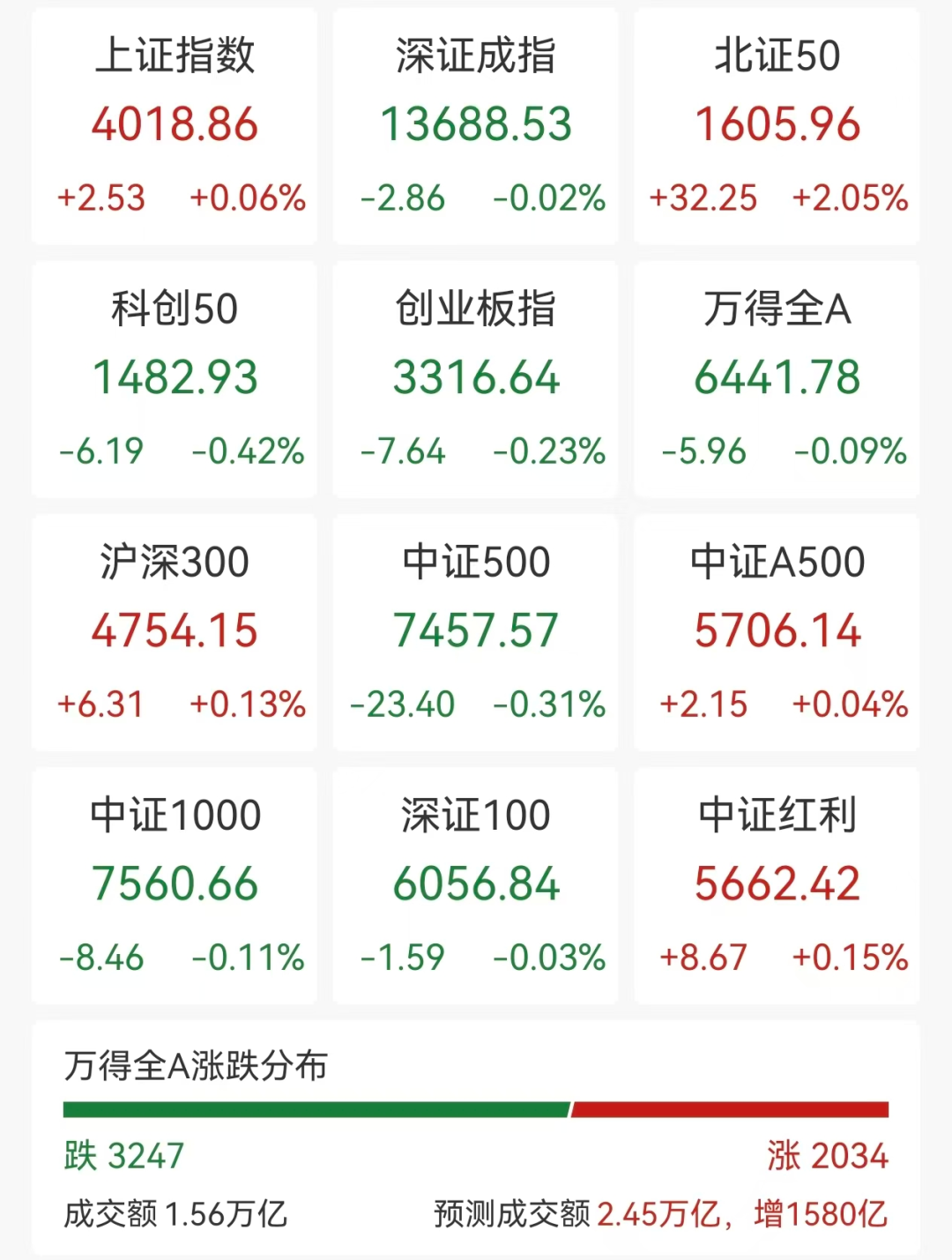 沪深两市半日成交额1.56万亿,较上个交易日放量1078亿。全市场下跌个股3247只。