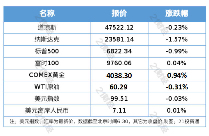 1、美国三大股指全线收跌,道指跌0.23%,标普500指数跌0.99%,纳指跌1.57%。波音跌超6%,亚马逊跌逾3%,领跌道指。万得美国科技七巨头指数跌2.15%,Meta跌超11%,特斯拉跌逾4%。中概股多数下跌,小马智行跌近7%,世纪互联跌超5%。