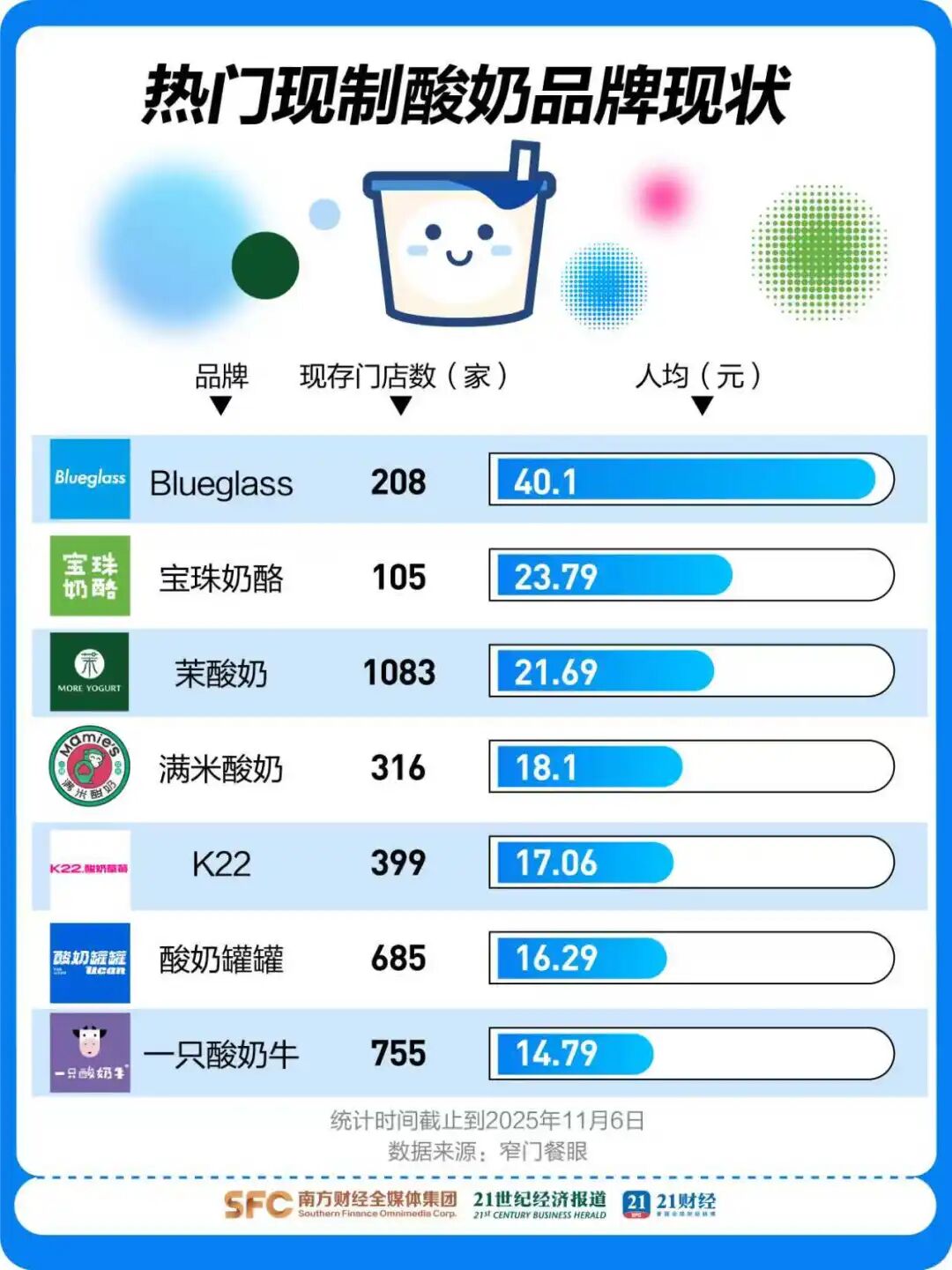 天眼查显示,Blueglass创立于2012年,隶属于北京悦活餐饮管理有限公司,创始人谷勇同样担任该公司法定代表人。Blueglass在2020—2021年完成了两轮融资(B轮超2亿元),投资方包括愉悦资本、华创资本、优山资本等,曾计划三年开千店,目前仅约200家门店。这并非个例,传统高端现制酸奶品牌正集体收缩:茉酸奶2024年3月起酸奶奶昔系列(除一款外)从520g减至420g、价格从30元降至20元,上半年闭店数超过去四年总和;一只酸奶牛被新希望乳业收购后业绩下滑,2024年退出财报并赔偿4460万元,门店从3000家目标缩减至800多家;蓝熊鲜奶、宝珠奶酪等也面临相似困境。
