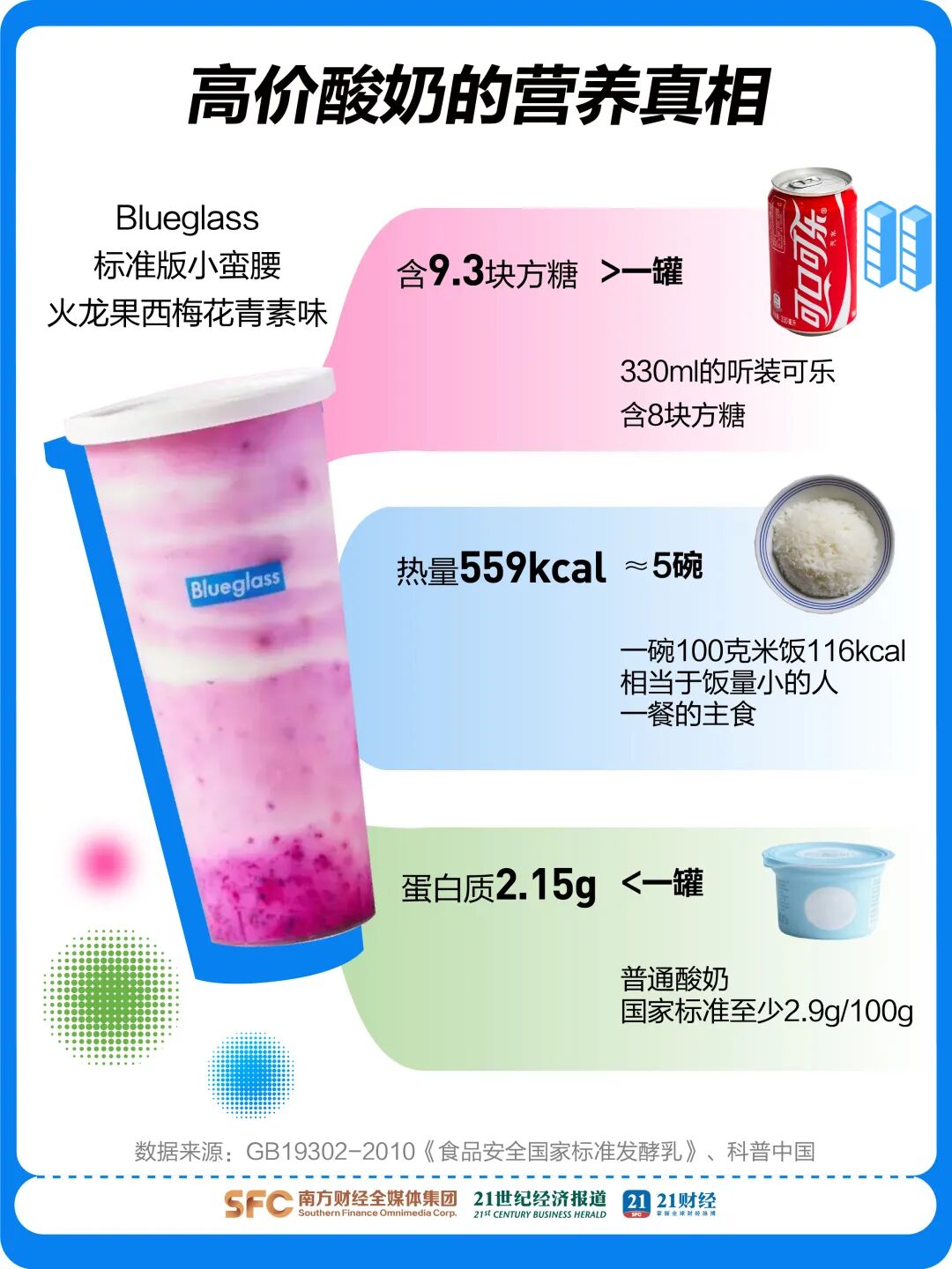 更扎心的是它的热量陷阱,含糖量惊人——以550ml一杯「Blueglass标准版小蛮腰火龙果西梅花青素味」为例,根据知乎日报测算,这样一杯酸奶的一杯糖含量是在42g,超过了每日糖建议摄入量的推荐量,甚至快超过上限。几乎跟可乐的含糖量有的有一拼!且每一杯的热量约超500kcal,约等于5碗米饭(100g,约等于一个人一餐的主食量)的热量。