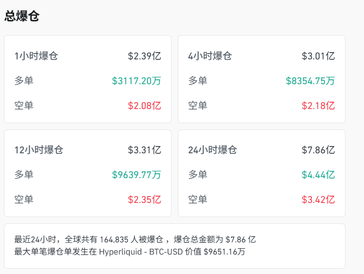 加密货币方面,多数加密货币持续下挫,比特币跌1.32%,索尔币、以太币跌近2%。据CoinGlass数据显示,过去24小时内,加密货币共有超16万人爆仓。