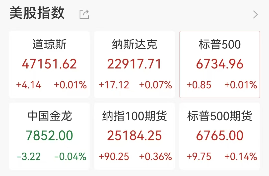 当地时间11月17日,美股低开高走,三大指数悉数转涨。截至23:16,道指涨0.01%,标普500指数涨0.01%,纳指涨0.07%。