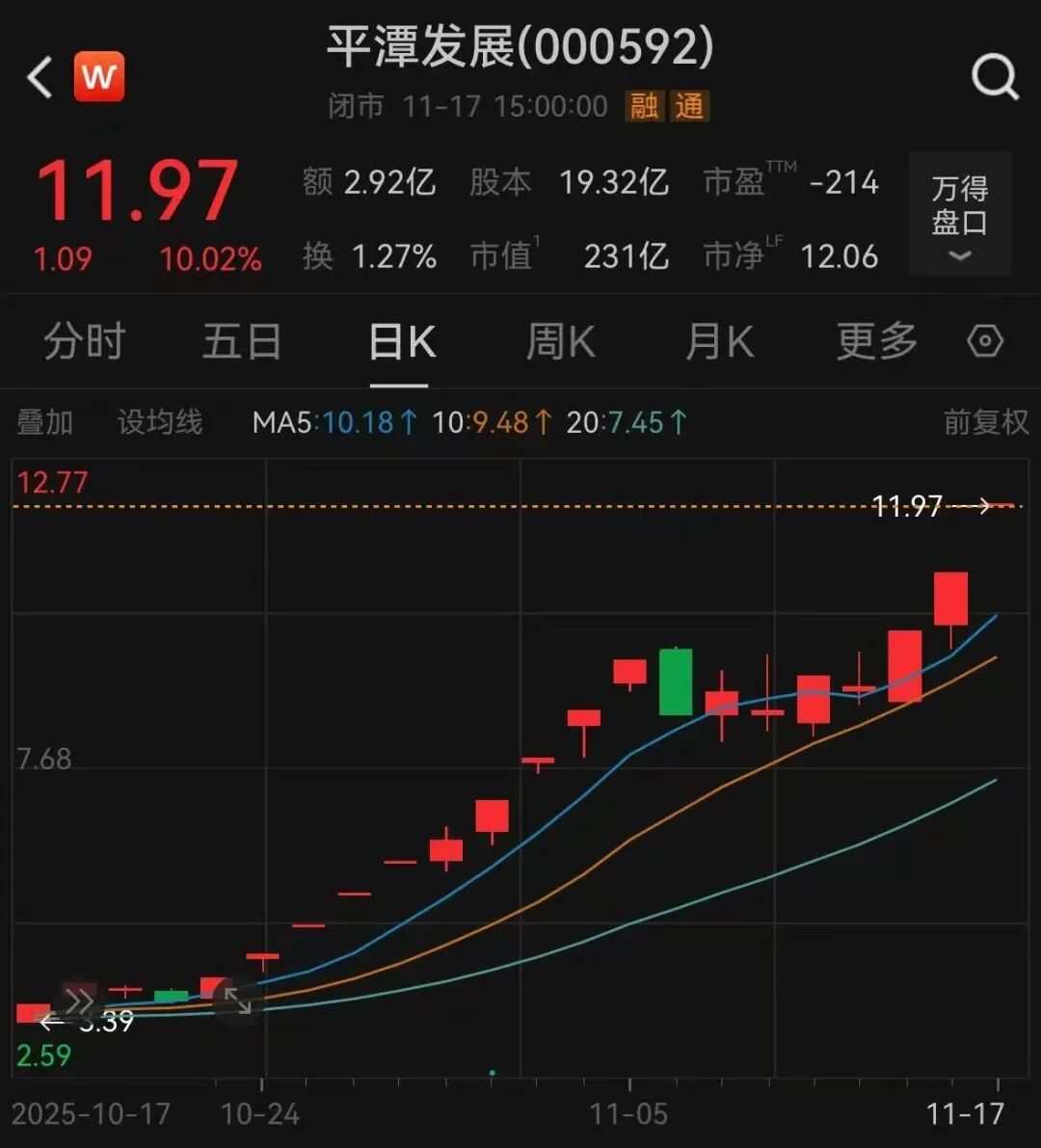 同日,平潭发展(000592)也发布风险提示公告:自10月17日至11月17日以来,公司股票价格涨幅为255.19%,其间6次触及股票交易异常波动情形、1次触及股票交易严重异常波动情形,股价涨幅严重背离公司基本面。经公司申请,公司股票自11月18日开市起停牌,待核查结束并披露相关公告后复牌,预计停牌时间不超过3个交易日。