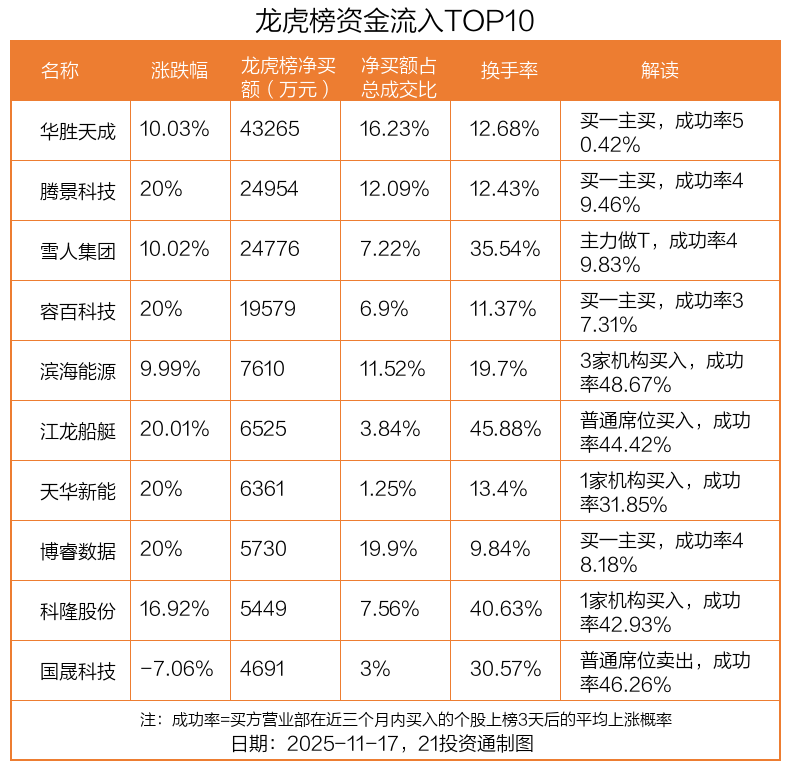 11月17日,上证指数下跌0.46%,深证成指下跌0.11%,创业板指下跌0.2%。盘后龙虎榜数据显示,共有48只个股因当日异动登上龙虎榜,资金净流入最多的是华胜天成(600410.SH),达4.33亿元。