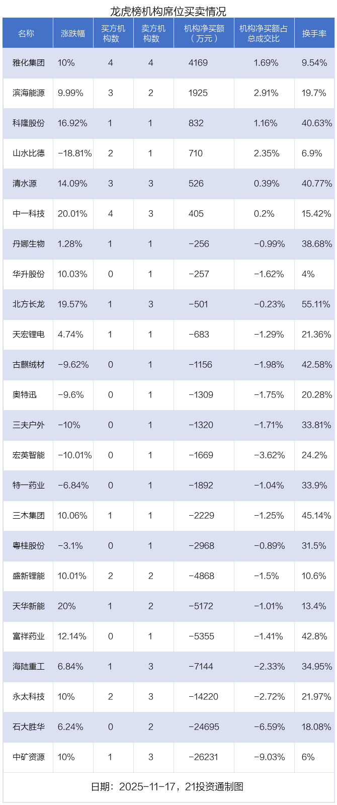 11月17日,24只个股龙虎榜出现了机构的身影,机构合计净卖出9.34亿元。具体来看,机构净买入6股,净卖出18股。