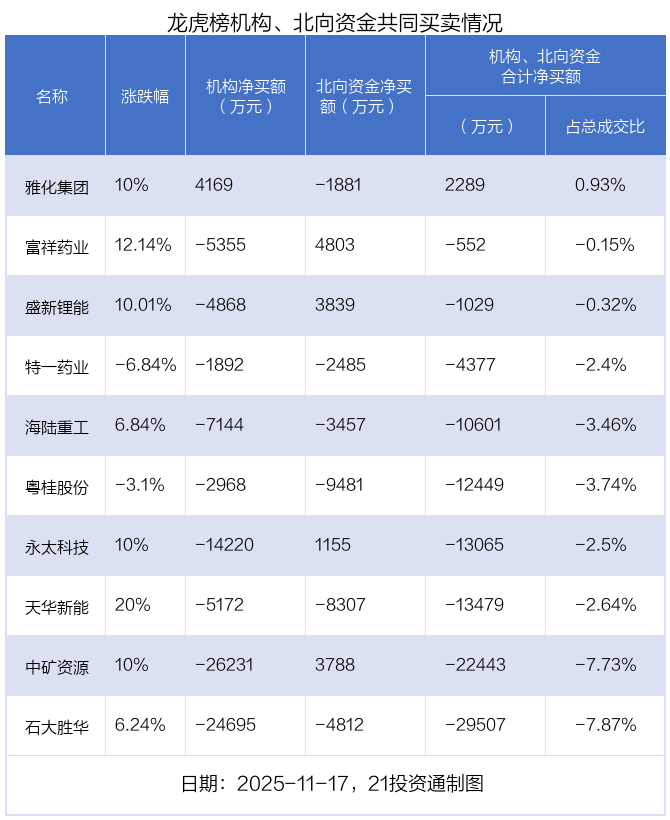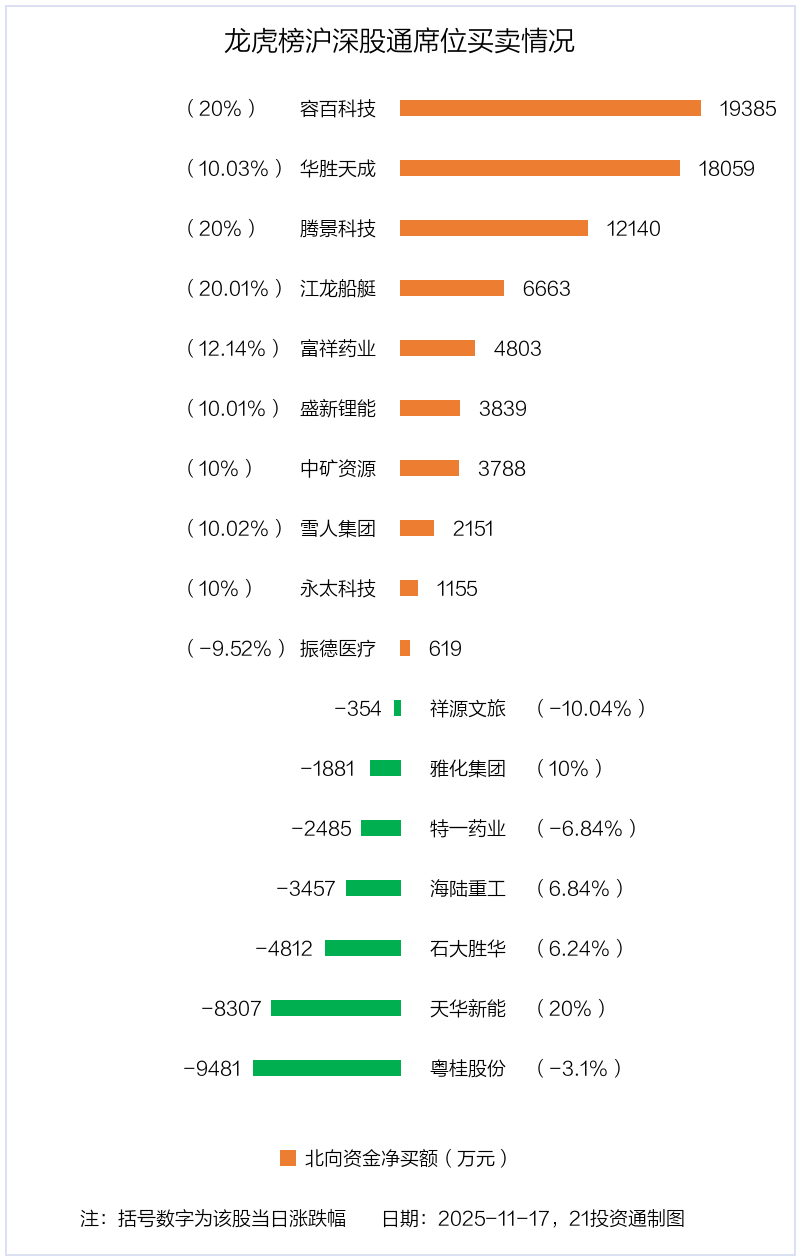 11月17日,北向资金参与龙虎榜中的个股共有17只,合计净买入4.18亿元。其中沪股通净买入4 股,净卖出2 股,合计净买入4.5亿元;深股通净买入6 股,净卖出5 股,合计净卖出3211.61万元。