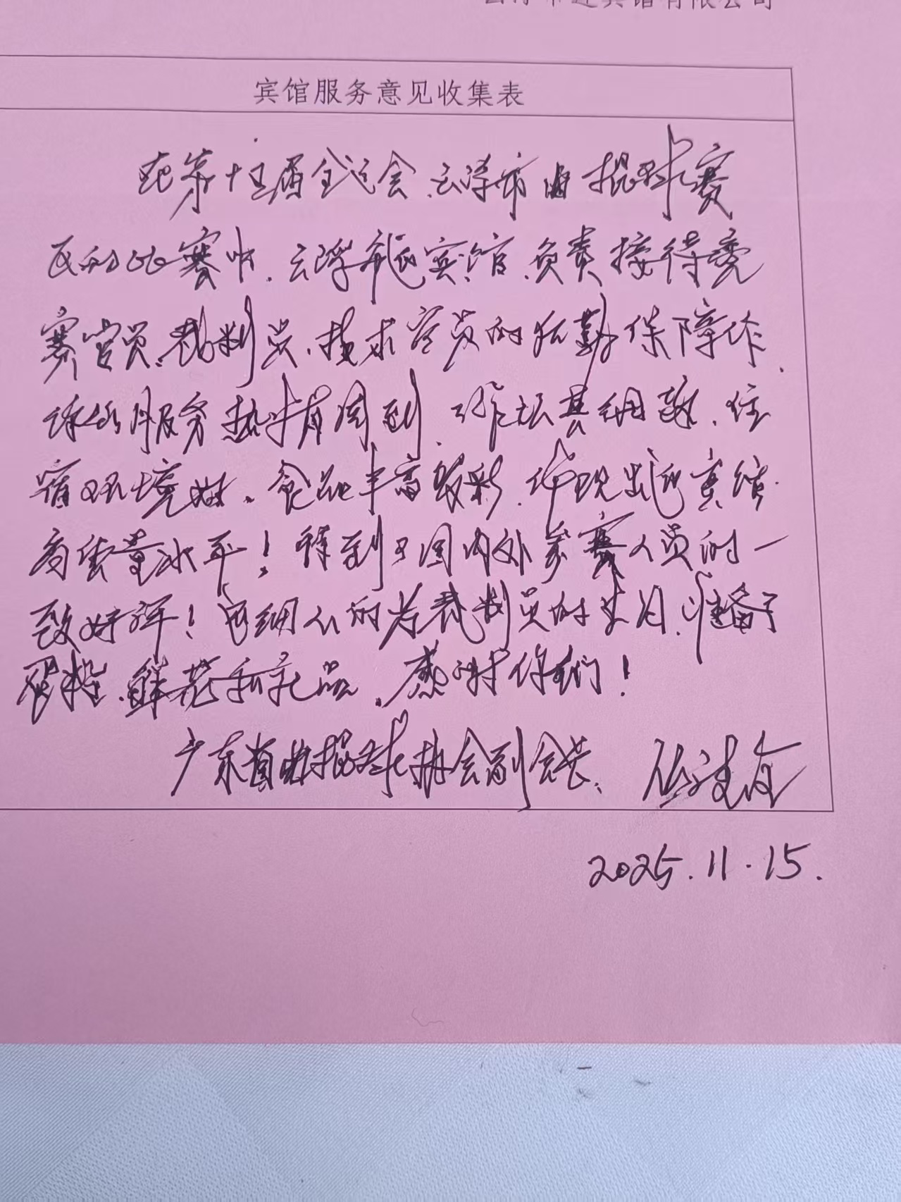 这封手写信的重量,源于云浮后勤团队的无数个 “细节时刻”。餐饮间,为外籍裁判精心配备的英文菜品标识,让多元口味与国际习惯精准契合;客房里,雅致舒适的环境成了技术官员卸下疲惫的 “港湾”;赛场外,交通调度的高效、家政服务的细致…… 一个个场景串联起 “云浮保障网”,也让参赛团队真切感受到了城市的温度。