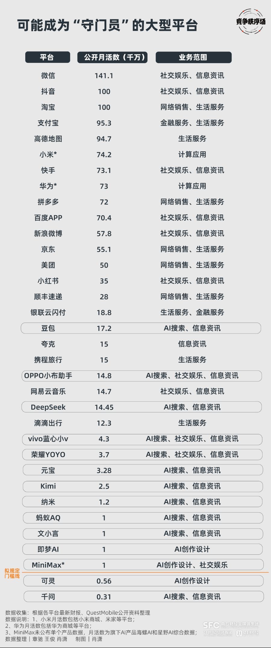 根据征求意见稿,除却阿里、腾讯、蚂蚁、字节跳动、百度、微博、小红书等互联网平台,DeepSeek、MiniMax、Kimi等迅速增长的AI公司,以及OPPO、vivo、荣耀等智能终端厂商,不少用户规模也满足征求意见稿中的“用户超5千万或月活超1千万”等条件,同样可能进入大型网络平台的序列。