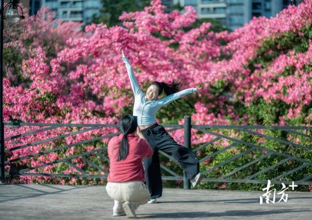 连日来,广东各地异木棉陆续进入盛花期,粉色、白色花瓣在蓝天映衬下更显梦幻,上演冬日限定浪漫。