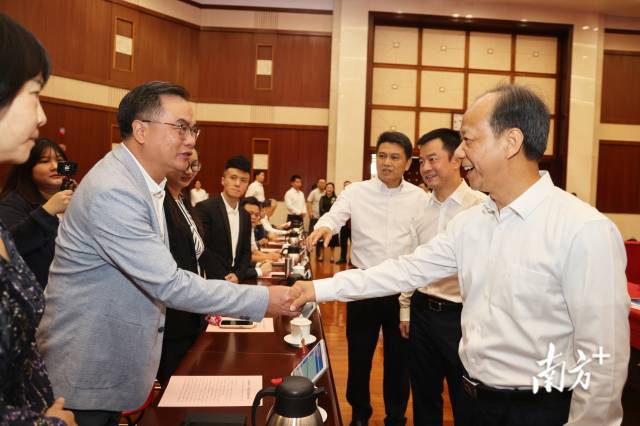 会议开始前,中山市委书记郭文海,市委副书记、市长尹念红与企业家握手。