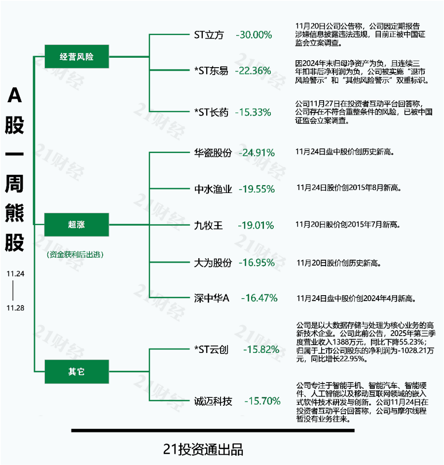 剔除最近一个月上市的次新股,本期十大熊股中,ST立方(300344.SZ)以30.00%的跌幅成为本期的最熊股。华瓷股份(001216.SZ)、*ST东易(002713.SZ)、中水渔业(000798.SZ)、九牧王(601566.SH)等股的周跌幅均在15%以上。