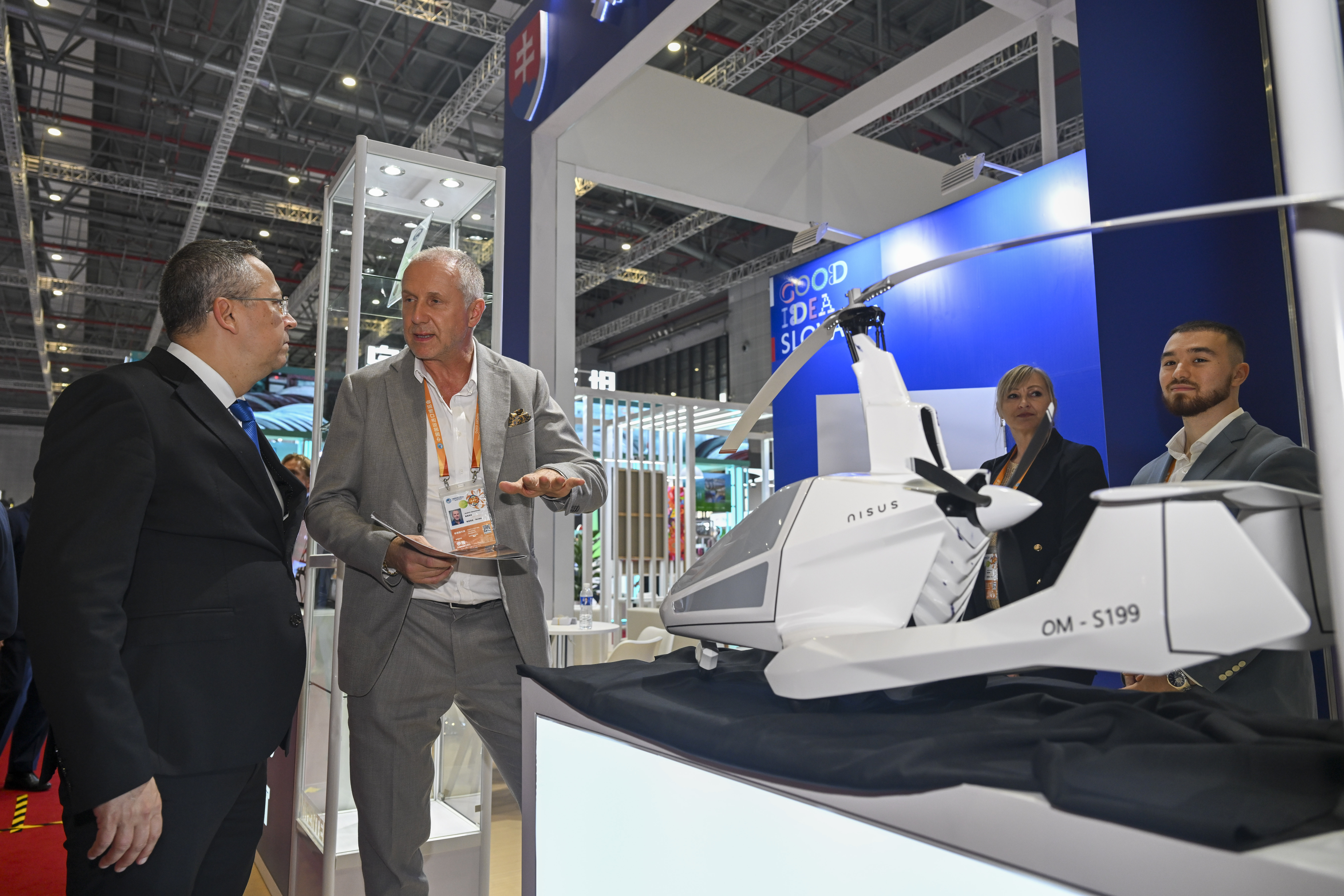 11月5日,在第八届进博会国家展斯洛伐克馆,参展商(左二)在向嘉宾(左一)介绍一款飞机产品。新华社记者 陈浩明 摄