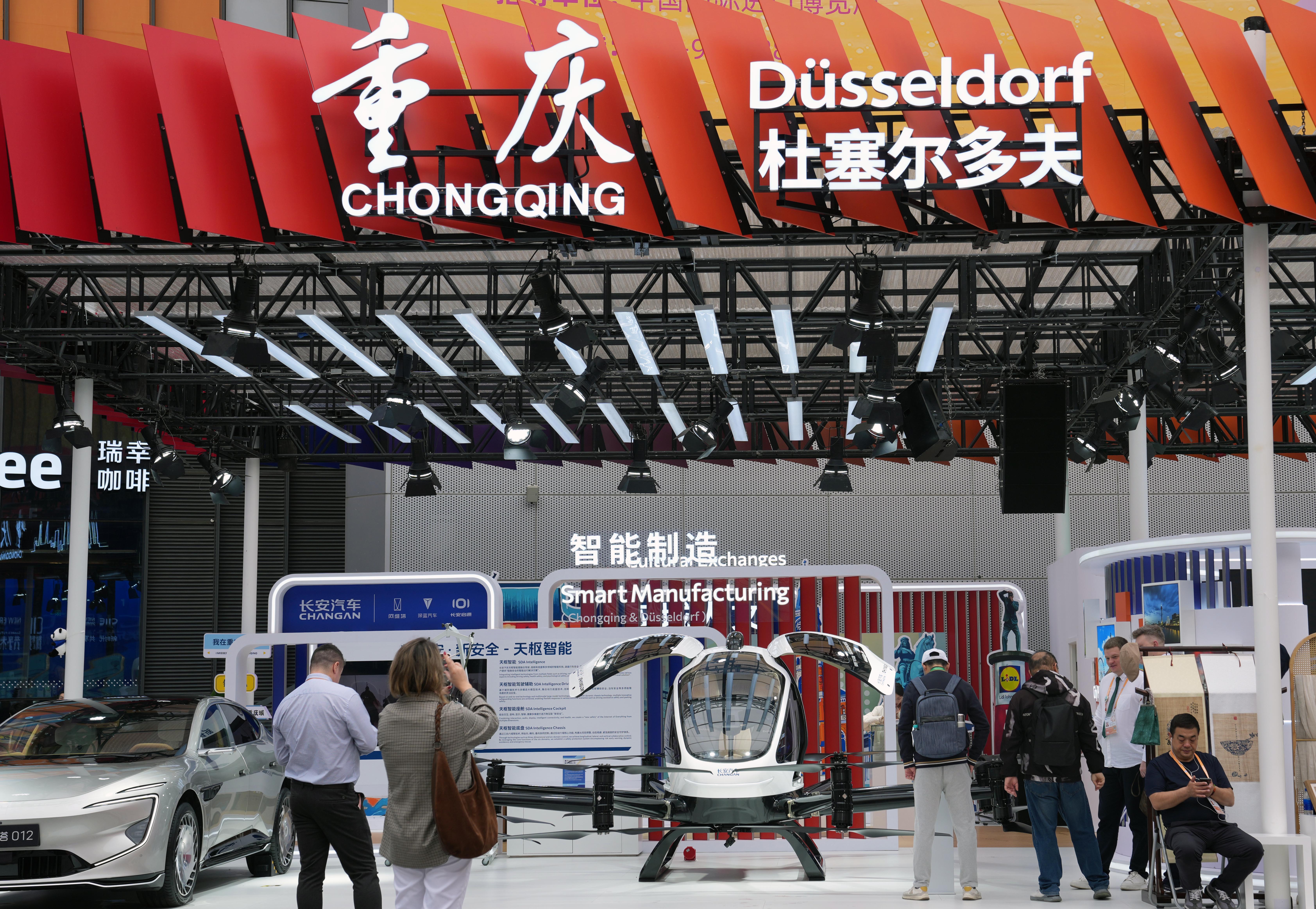 这是中国重庆与德国杜塞尔多夫在第八届进博会上共同举办的双城联展现场,展出内容涵盖文化、经贸等领域合作成果(11月8日摄)。新华社记者 刘颖 摄