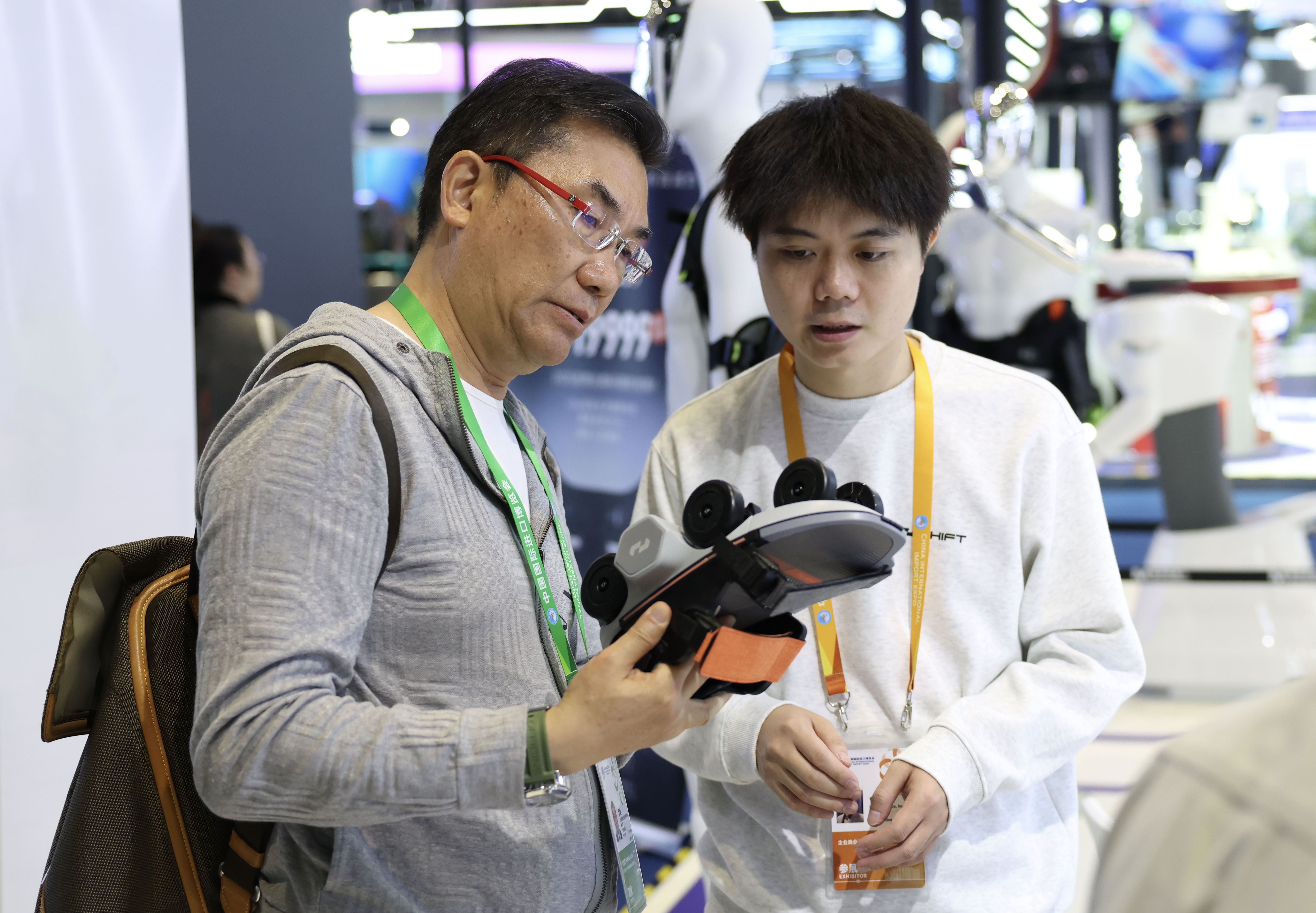 11月6日,在第八届进博会创新孵化专区瞬动科技展台,一名展商(右)向参观者介绍其全球首发的踏月者Air轮式外骨骼。新华社记者 孟晨光 摄