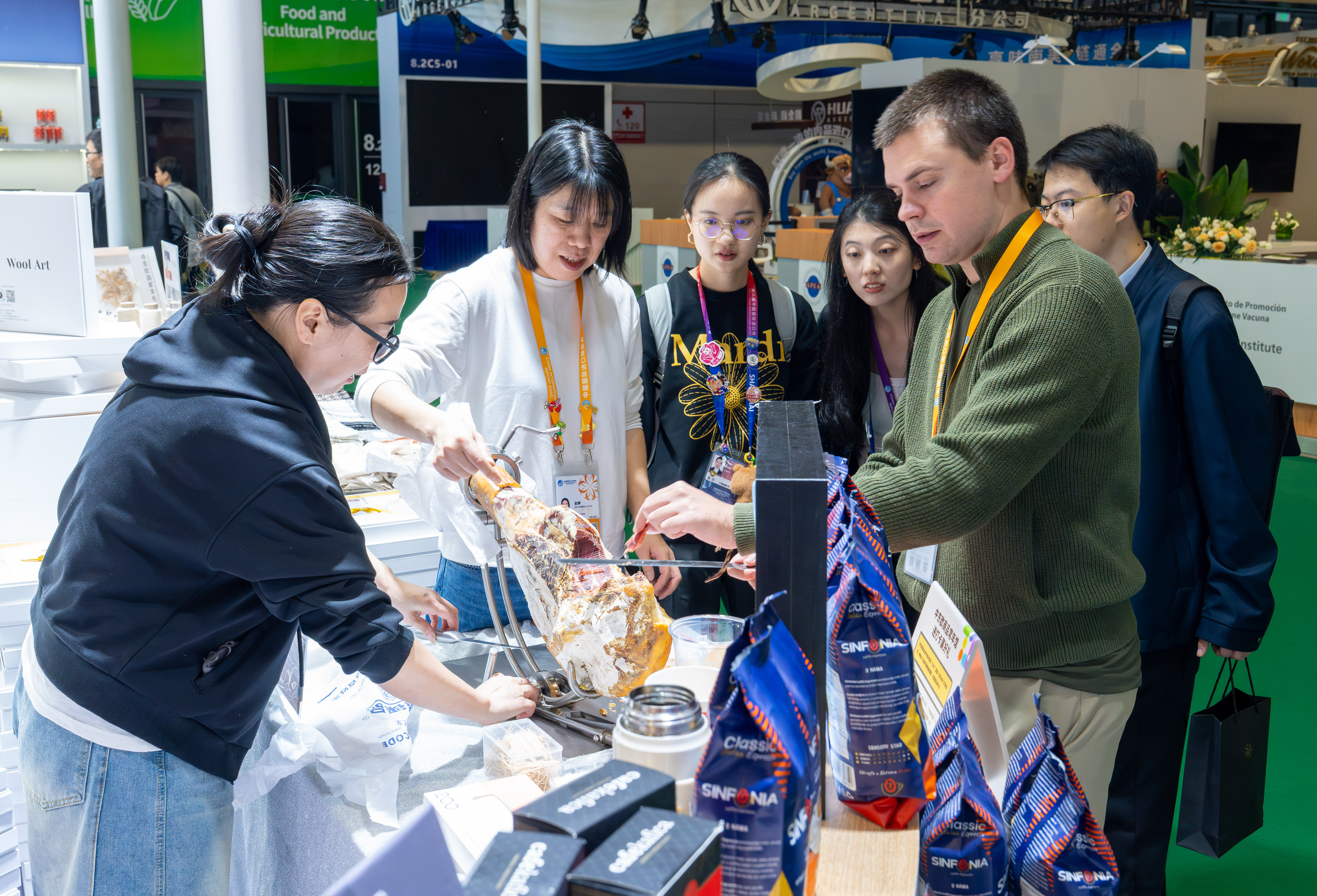11月5日,在第八届进博会农食产品展区,参展商为观众介绍伊比利亚火腿。新华社记者 周荻潇 摄