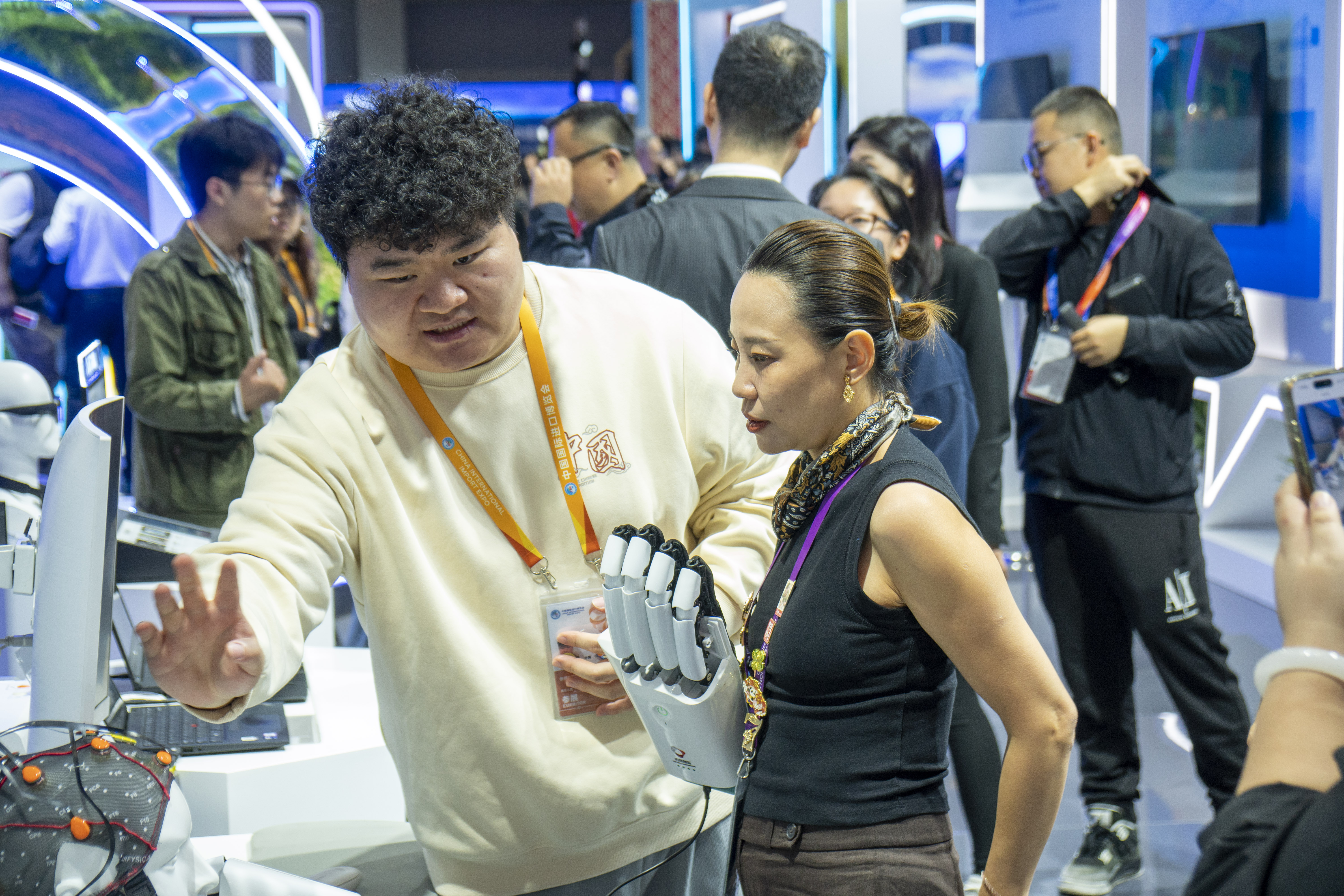 11月5日,观众在第八届进博会国家展中国馆了解非侵入式脑机接口机器人。新华社记者 丁赫 摄