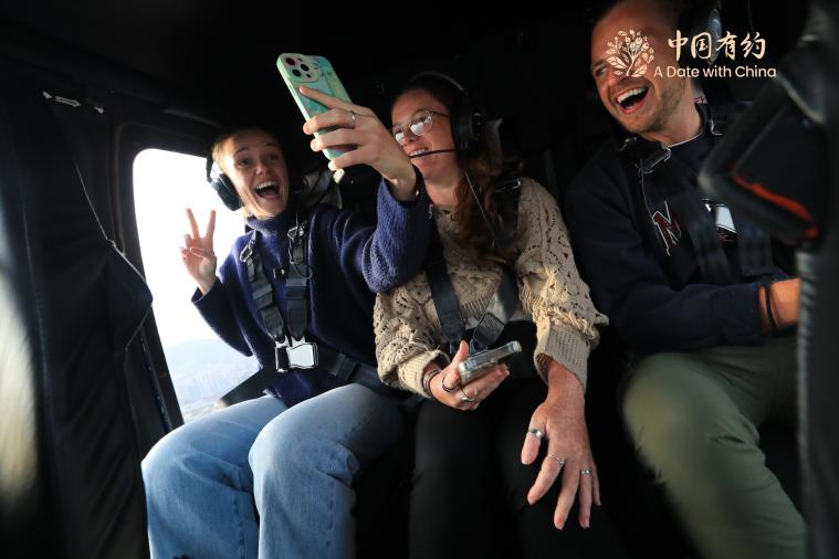 南非博主莉齐和国际友人乘坐低空直升机,从深圳市中心6分钟抵达梧桐阁顶峰。