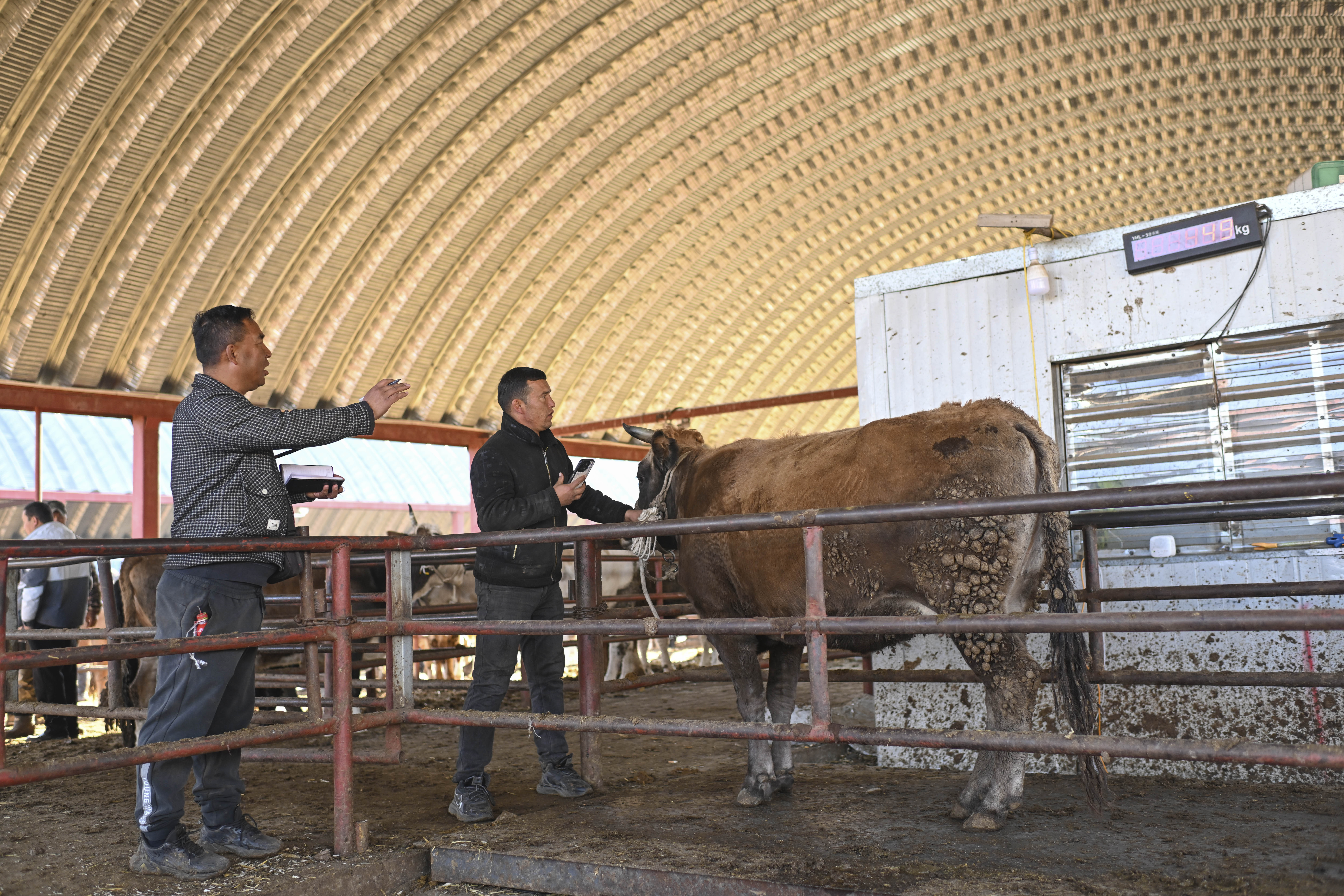 马军(左)在新疆创锦黄公农产品交易市场和售牛的村民一起,为牛称重、登记。