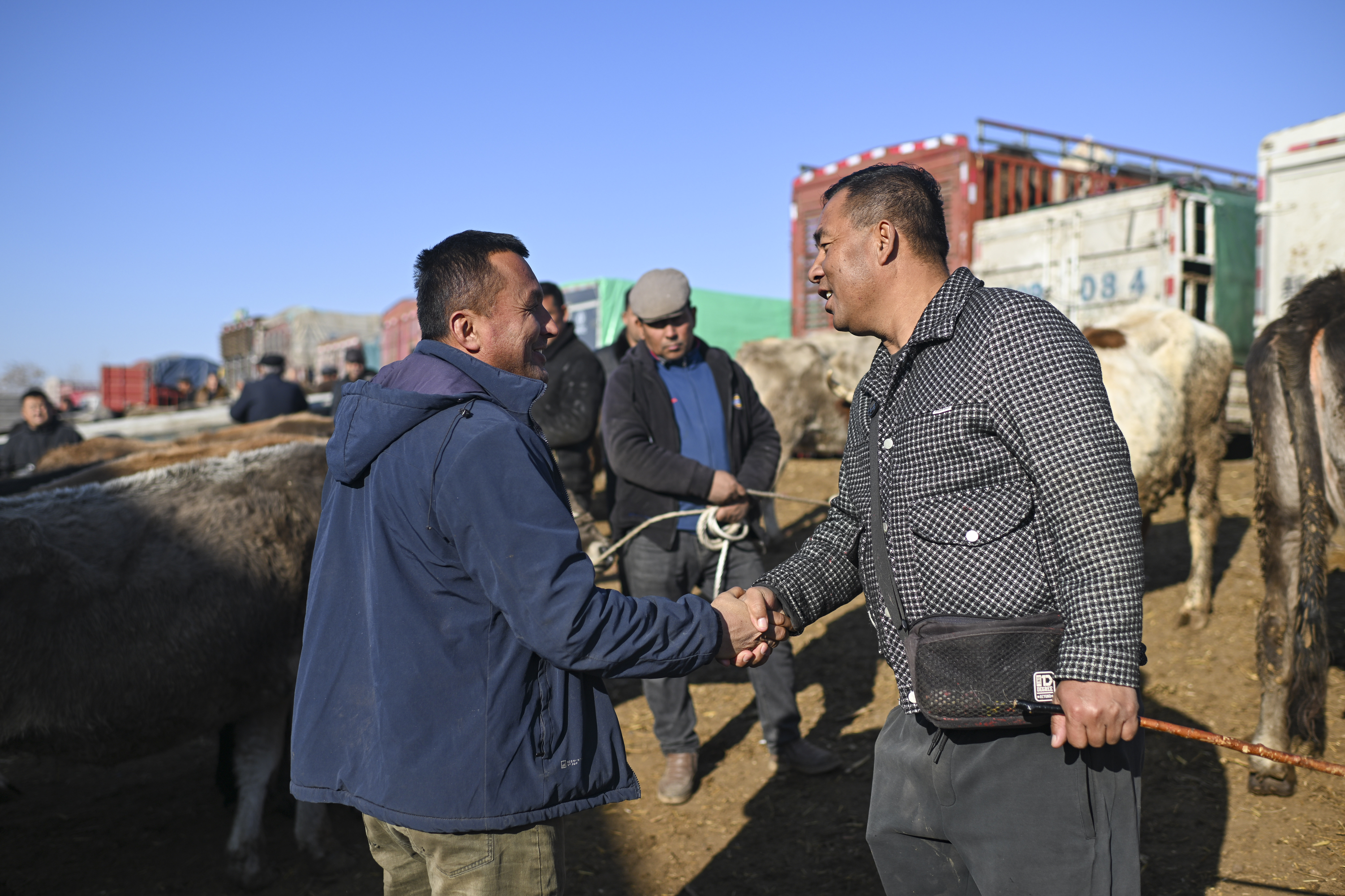 在新疆创锦黄公农产品交易市场,交易达成后,牲畜经纪人马军(右)与售牛的村民握手致意。