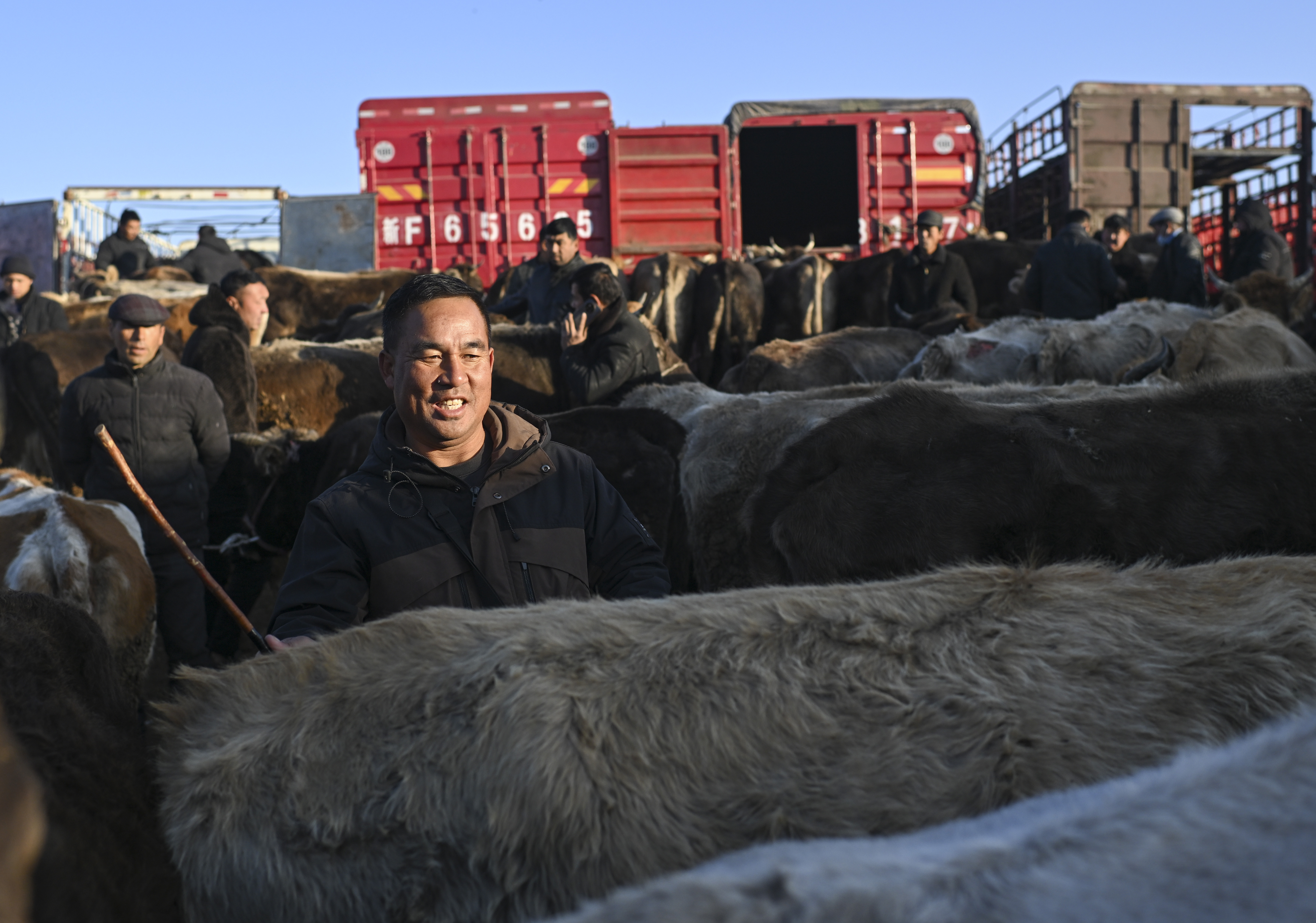 牲畜经纪人马军(中)带着来自青海的客户(左)在新疆创锦黄公农产品交易市场上选购牛。