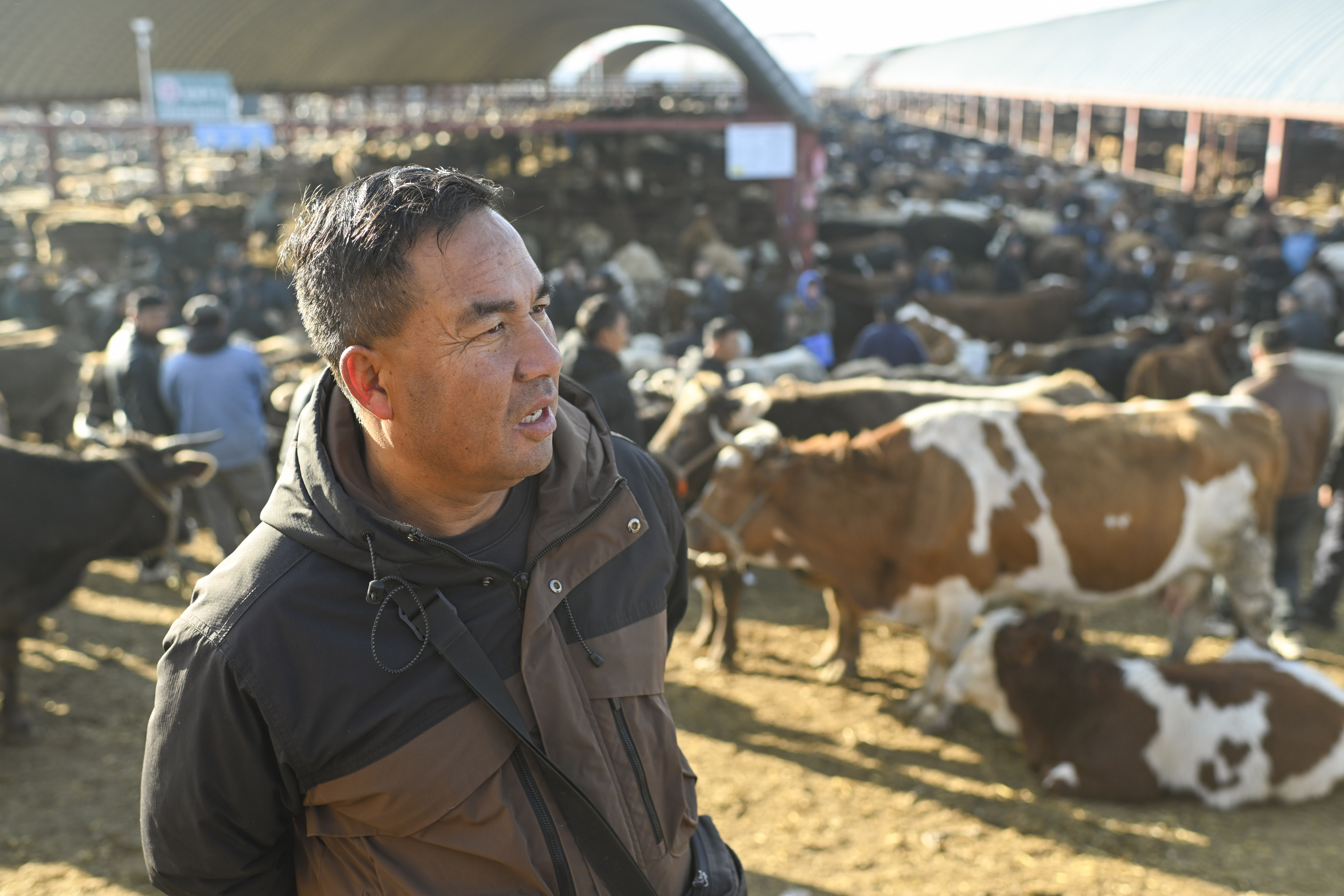 马军在新疆创锦黄公农产品交易市场为客户挑选牛。
