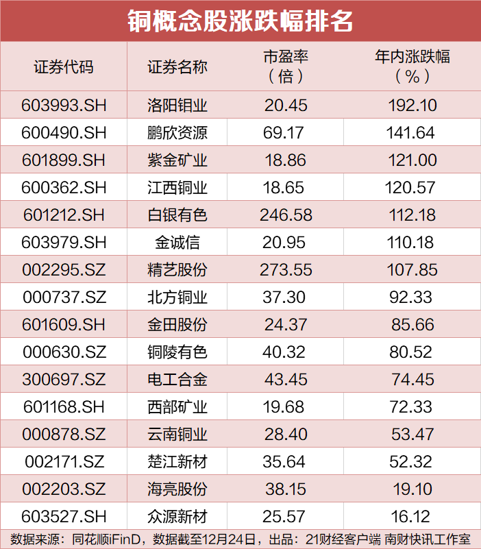 据证券时报统计,A股中属于铜板块的上市公司共有16家,12月以来普遍上涨,截至12月23日,平均涨幅达到8.58%,金诚信、白银有色、洛阳钼业等7股累计涨幅超过10%。