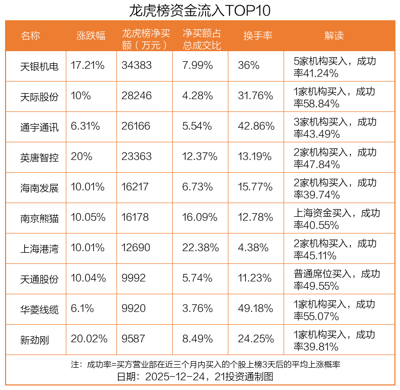 12月24日,上证指数上涨0.53%,深证成指上涨0.88%,创业板指上涨0.77%。盘后龙虎榜数据显示,共有52只个股因当日异动登上龙虎榜,资金净流入最多的是天银机电(300342.SZ),达3.44亿元。