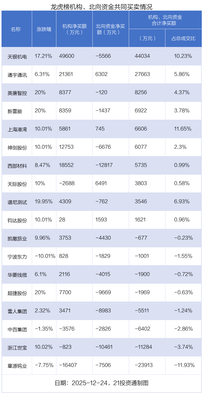 值得注意的是,机构和北向资金共同净买入了通宇通讯、钧达股份、上海港湾等3股;共同净卖出了中百集团、章源钨业、浙江世宝等3股;在天际股份,英唐智控,谱尼测试,新雷能,宁波东力,华菱线缆,凯撒旅业,天银机电,神剑股份,雪人集团,超捷股份,西部材料上出现分歧,机构净卖出天际股份2687.75万元,北向资金净买入6490.98万元;机构净买入英唐智控8376.53万元,北向资金净卖出120.36万元;机构净买入谱尼测试4308.58万元,北向资金净卖出762.47万元;机构净买入新雷能8358.73万元,北向资金净卖出1437.09万元;机构净买入宁波东力827.95万元,北向资金净卖出1829.17万元;机构净买入华菱线缆2115.76万元,北向资金净卖出4015.46万元;机构净买入凯撒旅业3753.15万元,北向资金净卖出4429.73万元;机构净买入天银机电4.96亿元,北向资金净卖出5565.72万元;机构净买入神剑股份1.28亿元,北向资金净卖出6676.17万元;机构净买入雪人集团3471.29万元,北向资金净卖出8982.53万元;机构净买入超捷股份7700.33万元,北向资金净卖出9668.93万元;机构净买入西部材料1.86亿元,北向资金净卖出1.28亿元。