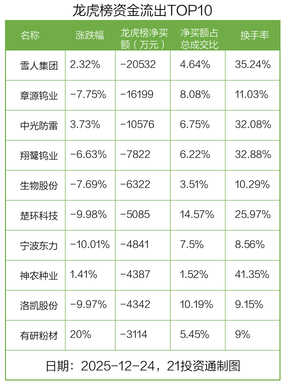 12月24日,北向资金参与龙虎榜中的个股共有25只,合计净卖出9.67亿元。其中沪股通净买入2 股,净卖出6 股,合计净卖出3.4亿元;深股通净买入3 股,净卖出14 股,合计净卖出6.27亿元。
