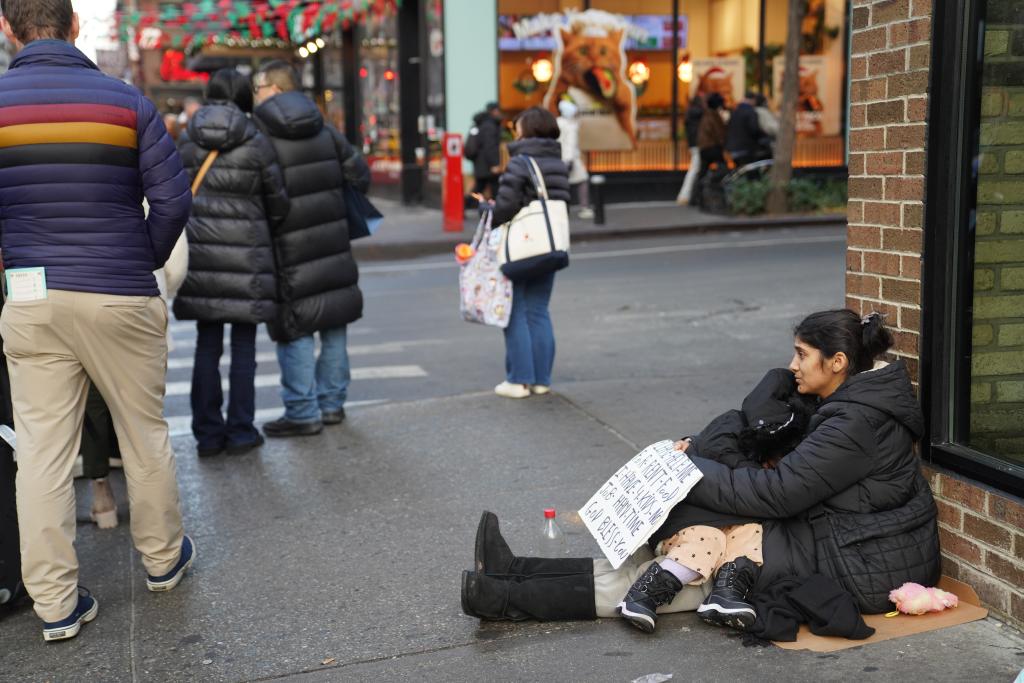 12月18日,一名女子在美国纽约曼哈顿街头寻求救助。新华社记者 张凤国 摄