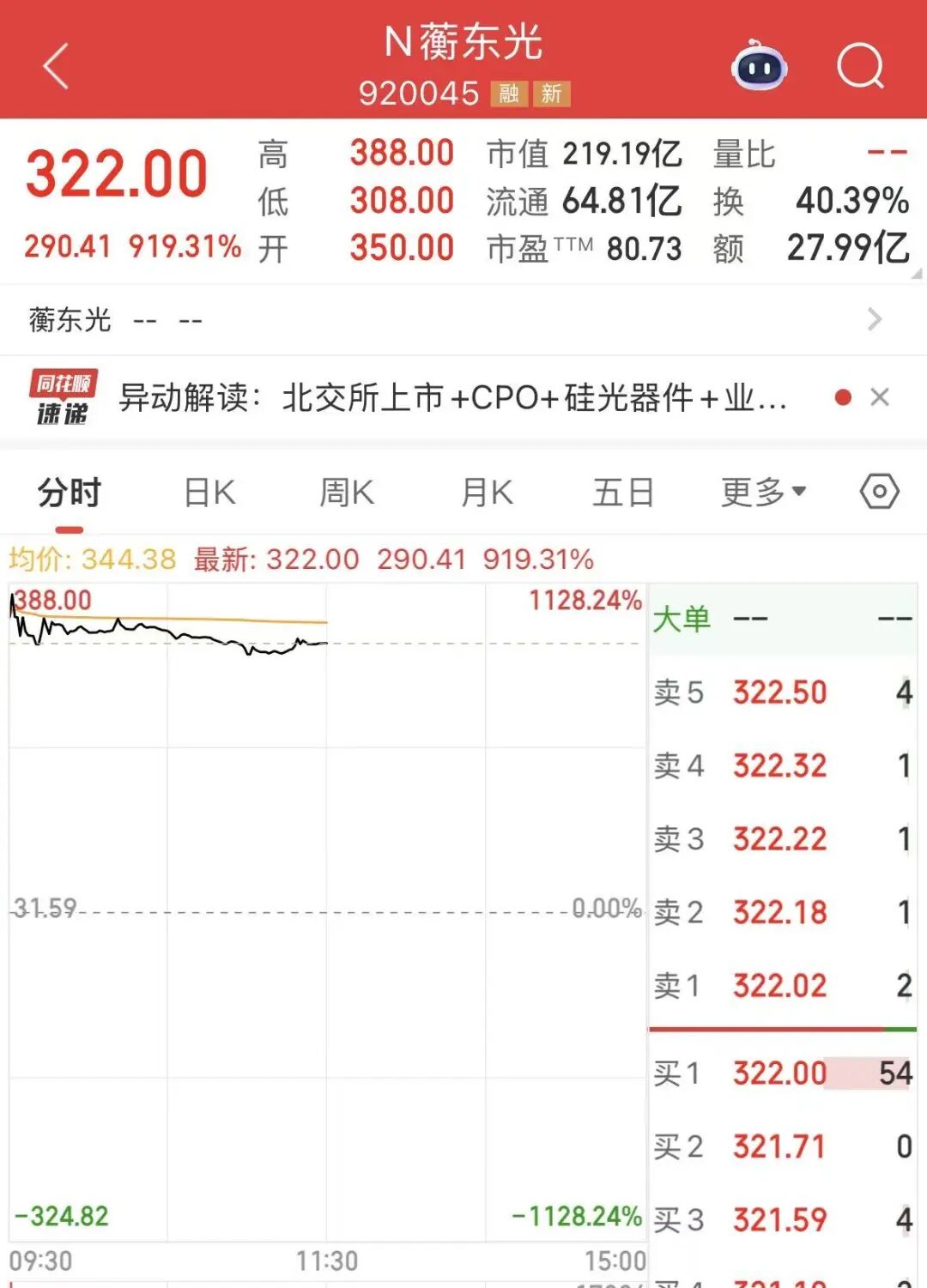2025年最后一个交易日,北交所迎来年终“压轴大戏”。光通信领域“小巨人”蘅东光(920045.BJ)正式登陆北交所,开盘涨幅达1008%,股价飙升至350元/股,开盘初期成交额便突破6亿元,打新投资者收益瞬间兑现。以发行价31.59元/股计算,中一签(100股)的投资者浮盈高达31841元,上演“年末大红包”行情。截至午间收盘,蘅东光报322元/股,涨幅收窄至919.31%。