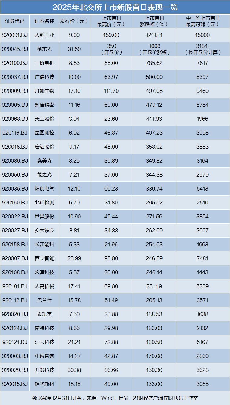 蘅东光的火爆表现并非个例,而是2025年北交所打新热潮的缩影。21财经·南财快讯记者据Wind统计,2025年北交所共有26只新股上市,实现“无一破发”的完美战绩,上市首日最低涨幅133%,最高涨幅达1211%,其中19只新股首日涨幅超200%。(详见)