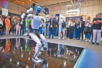 在葡萄牙里斯本举办的2025年网络峰会上,宇树科技的人形机器人和观众互动。新华社发