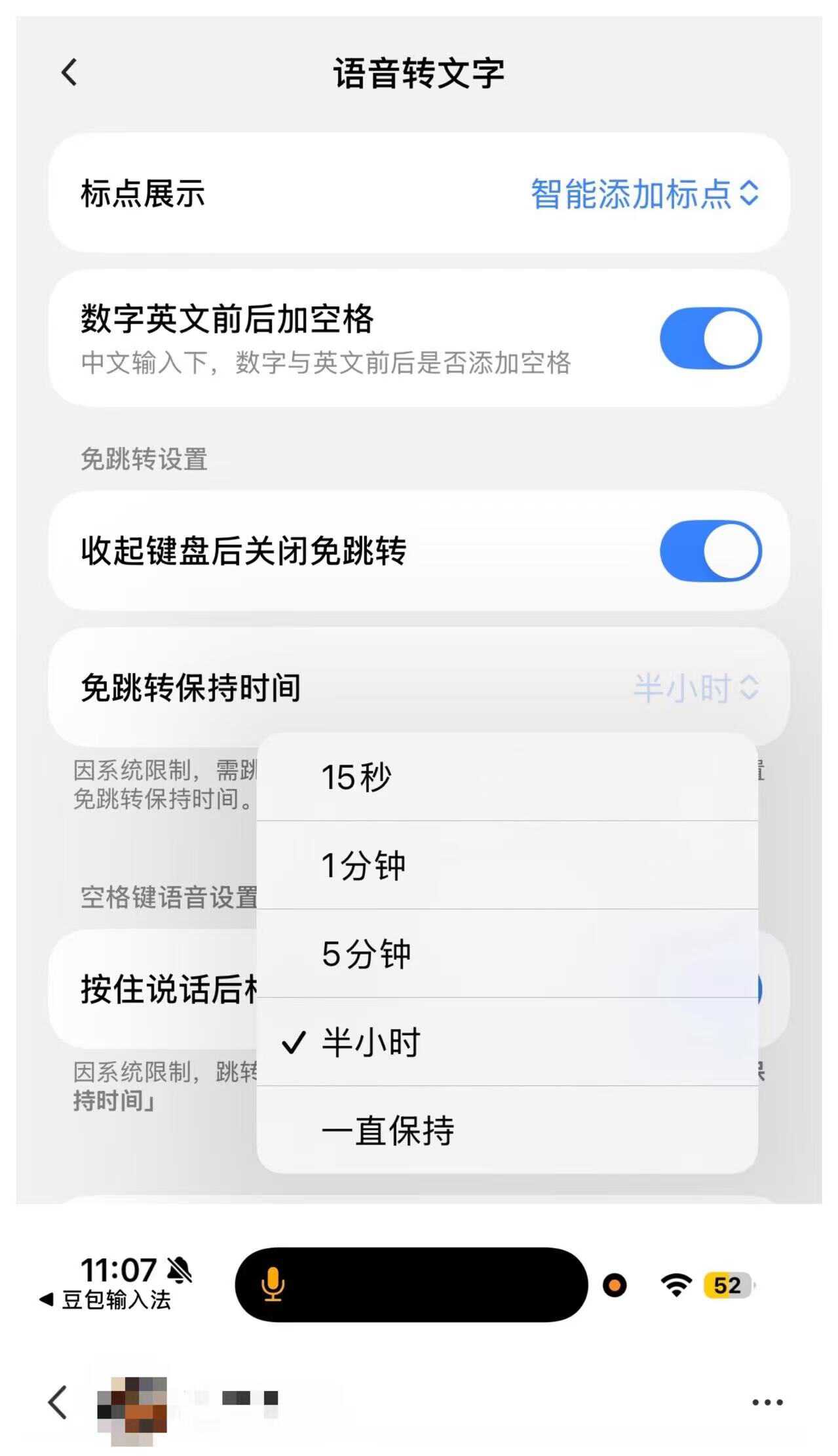 (上图:豆包输入法的语音免跳转时间,可选择“一直保持”)