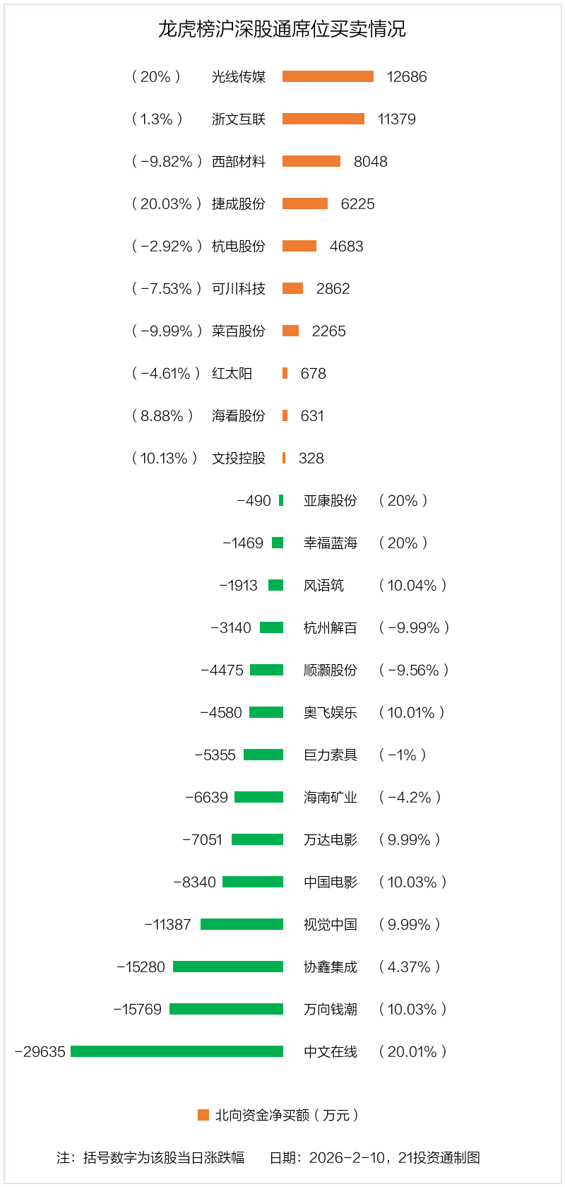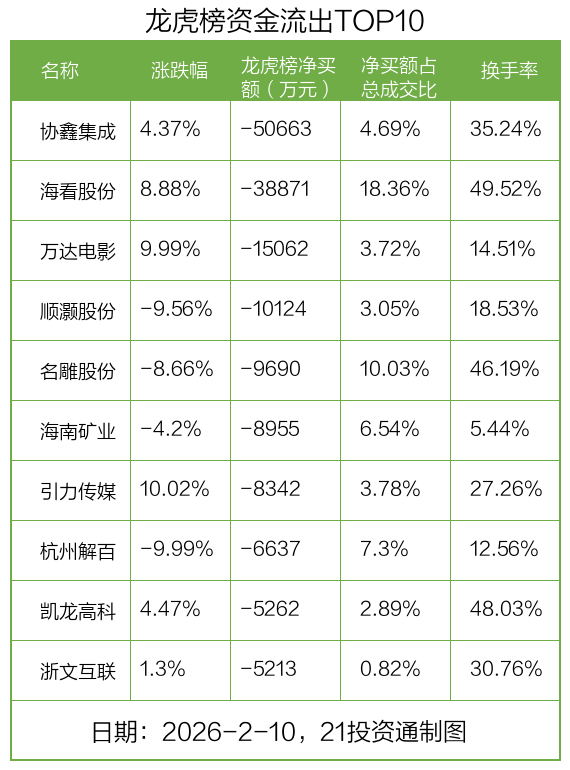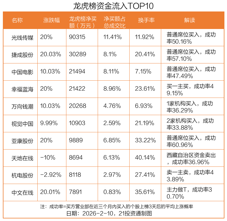 2月10日,上证指数上涨0.13%,深证成指上涨0.02%,创业板指下跌0.37%。盘后龙虎榜数据显示,共有46只个股因当日异动登上龙虎榜,资金净流入最多的是光线传媒(300251.SZ),达9.03亿元。