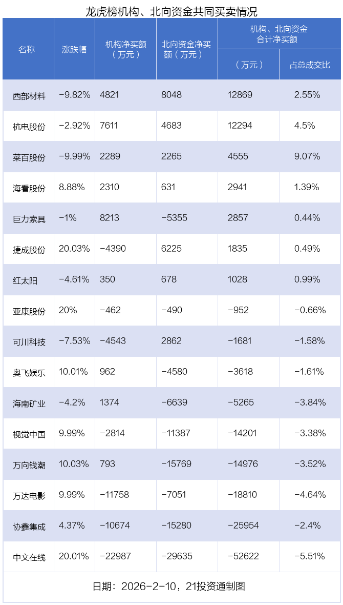 2月10日,26只个股龙虎榜出现了机构的身影,机构合计净卖出3.89亿元。具体来看,机构净买入14股,净卖出12股。