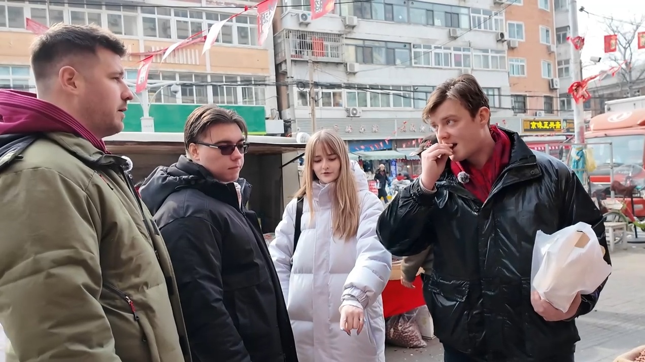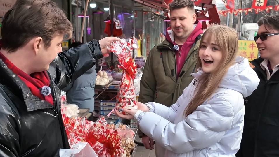 帝汉尼:我带他们吃了糖墩儿,买了干果、瓜子。人家店铺老板说“来尝尝”,我就让他们尝尝。他们问“这个还能尝吗?”我说怎么不可以,你不尝尝怎么知道好吃不好吃。这些对我们来说很普通、几乎天天都能遇到的事,对他们来说就很新鲜,嘛都新鲜。