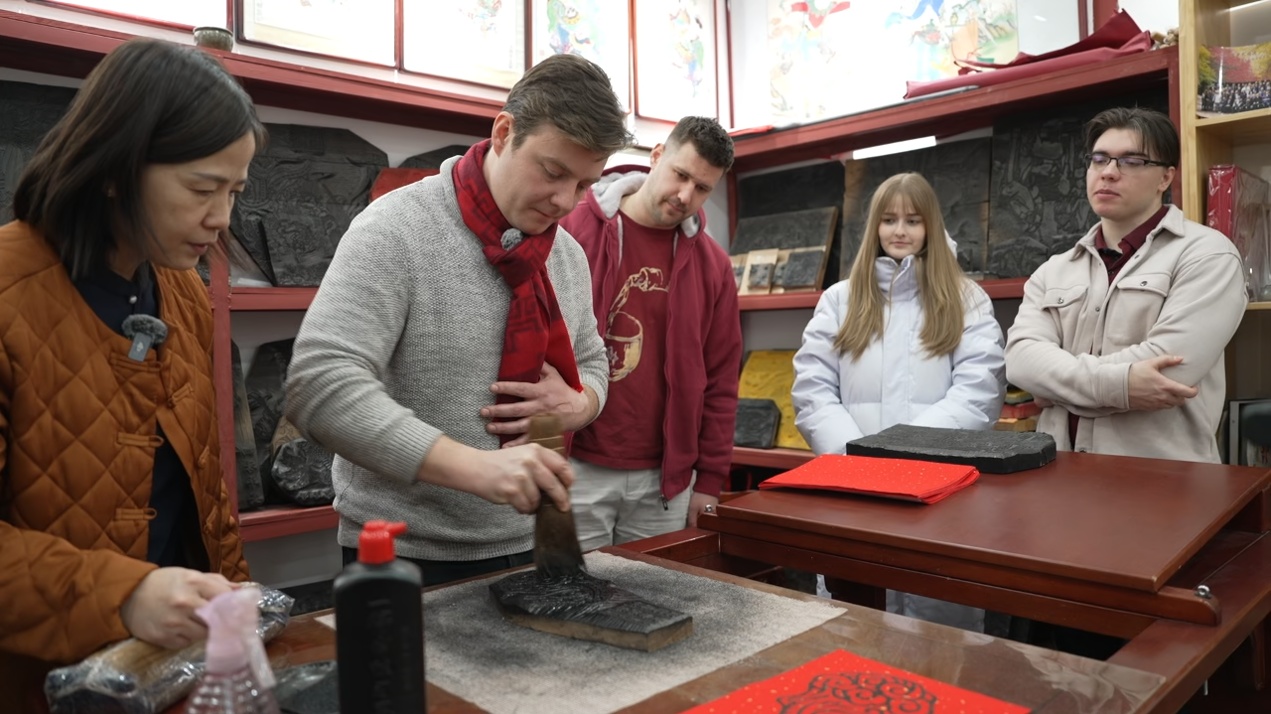 帝汉尼:我带他们感受中国传统文化,有剪纸,我们一起剪了一个“春”字。我还带他们去拓年画,先刷上墨,再把纸放上面,用木板刷刷刷,他们觉得很有意思。我们印了一个马。我们还一起包饺子,我像个老师一样教他们包饺子。其实我包得不好看,他们包得也不好看,主要是我们包饺子这个过程特别开心。