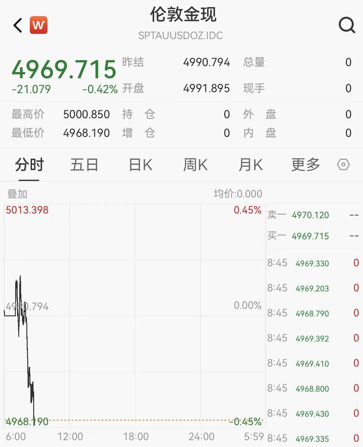 现货黄金向下跌破4900美元,日内下跌1.88%。