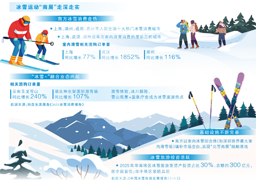 冰雪运动的普及,深刻改变着南方群众的休闲选择。室内雪场鳞次栉比,冰雪乐园人声鼎沸,曾经不那么容易触及的冰雪运动,正在走进越来越多南方消费者的日常,成为兼具时尚感与趣味性的休闲新选择。随着居民消费能力与休闲理念升级,南方冰雪消费需求持续迸发,冰雪经济内生动力不断增强,成为消费市场亮眼的新增长点。